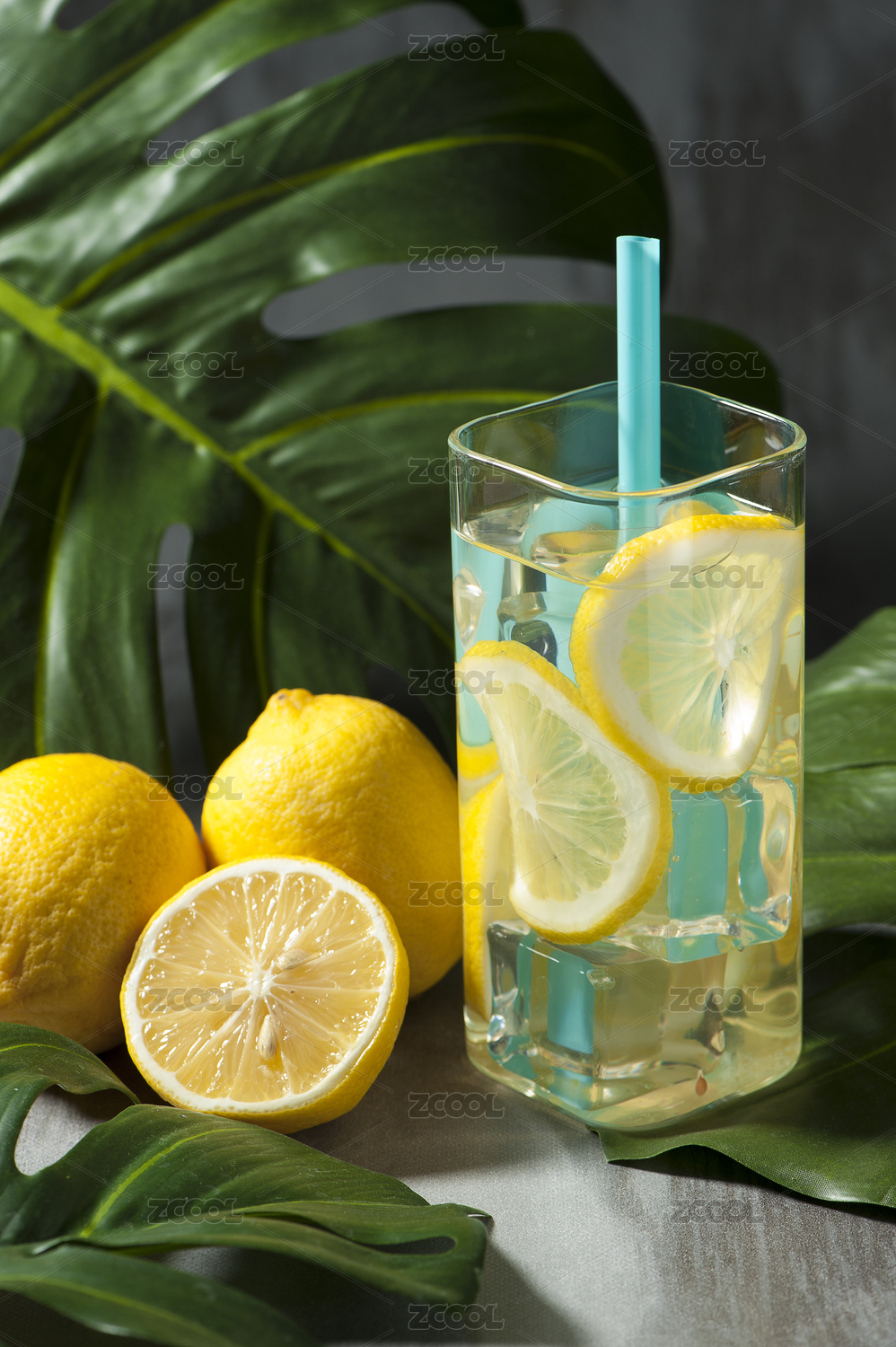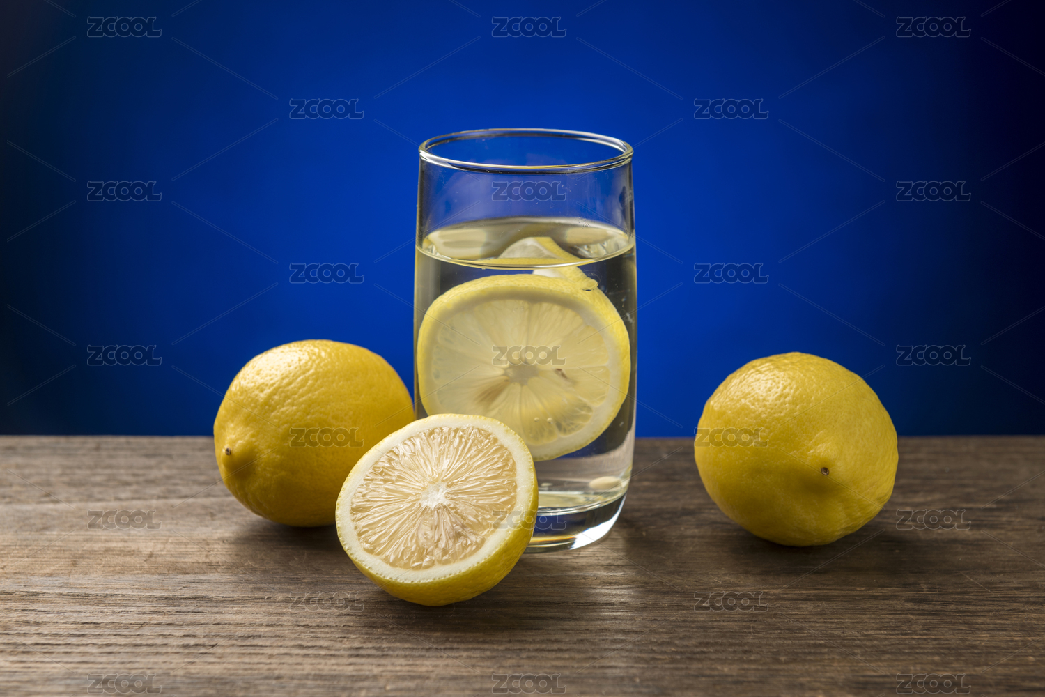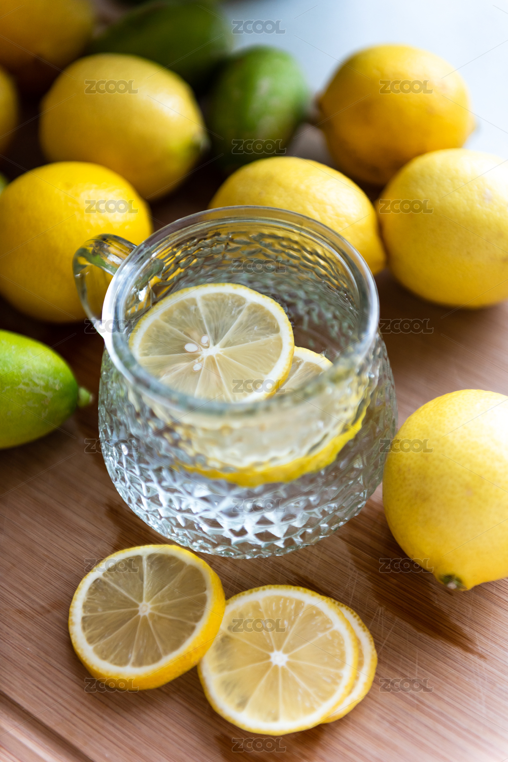 一盘柠檬一杯柠檬水摆放在木桌面上特写