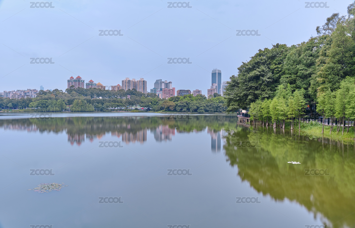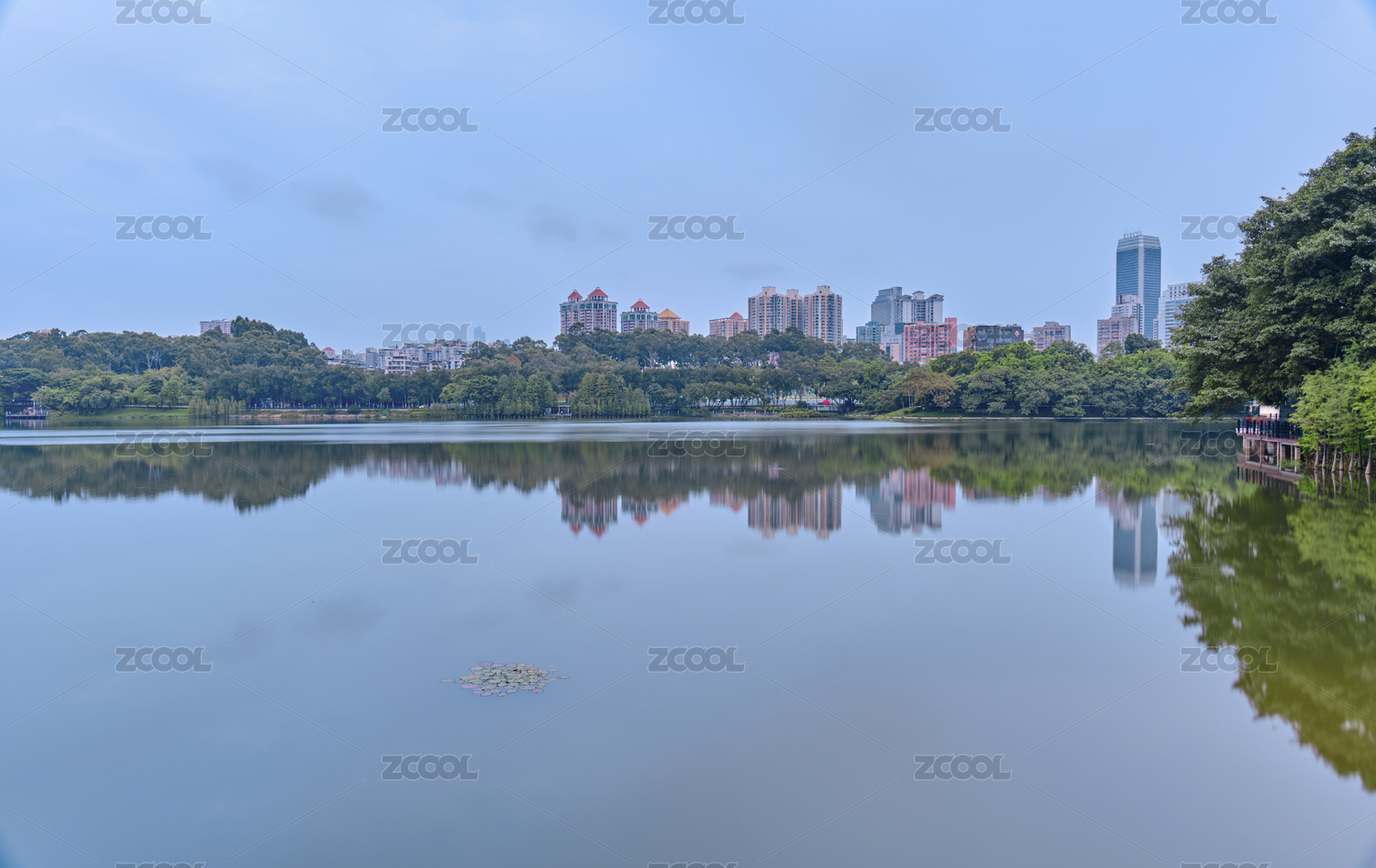 南宁南湖公园夕阳黄昏与城市摩天大楼建筑