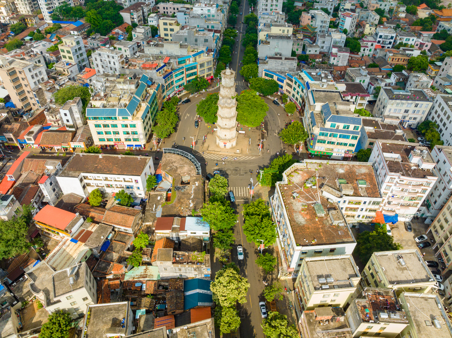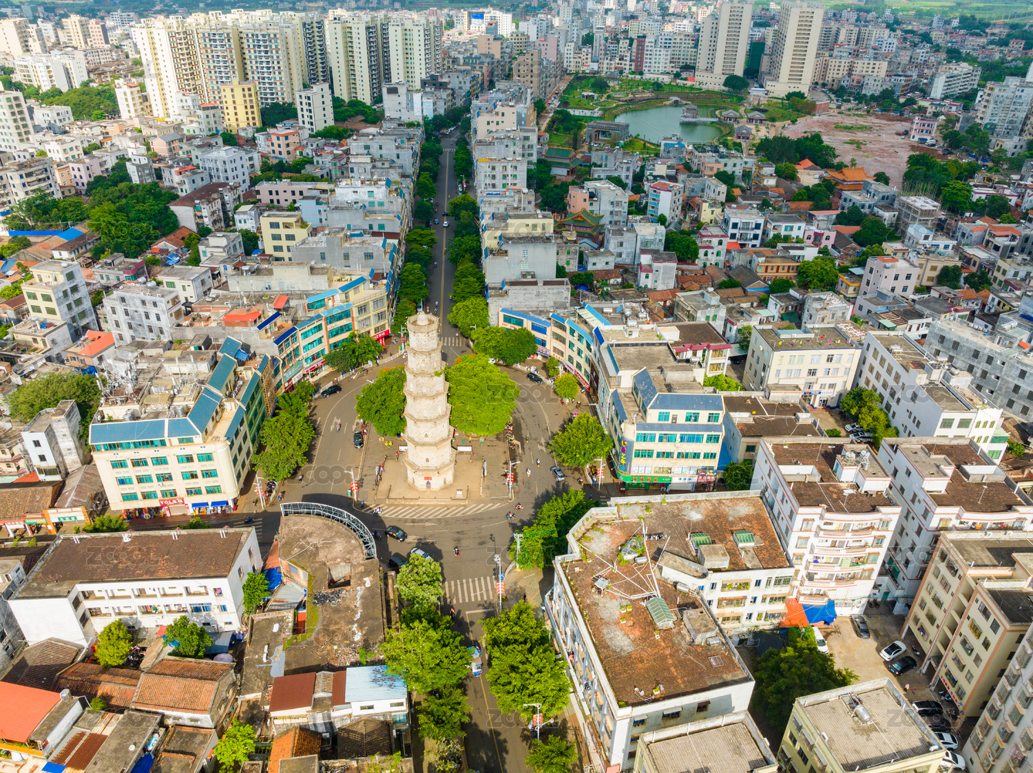 湛江,徐闻,登云塔,塔,古城区,古塔,城市天际线,航拍视角,住房,阳光
