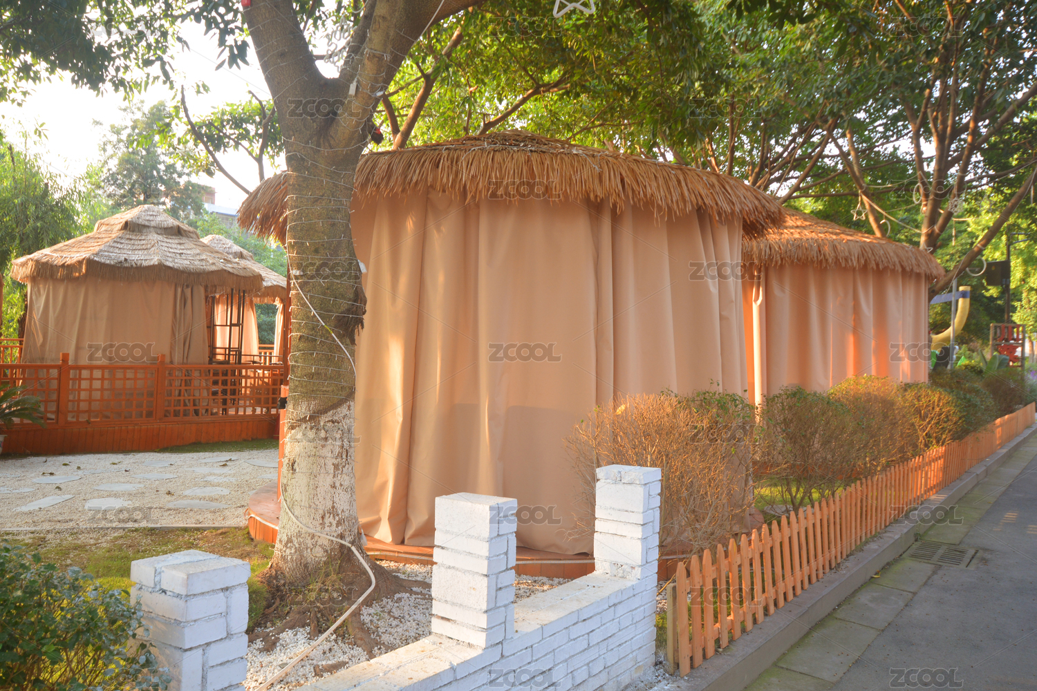 深圳园博园茅草伞下园林庭院休闲茶座景观
