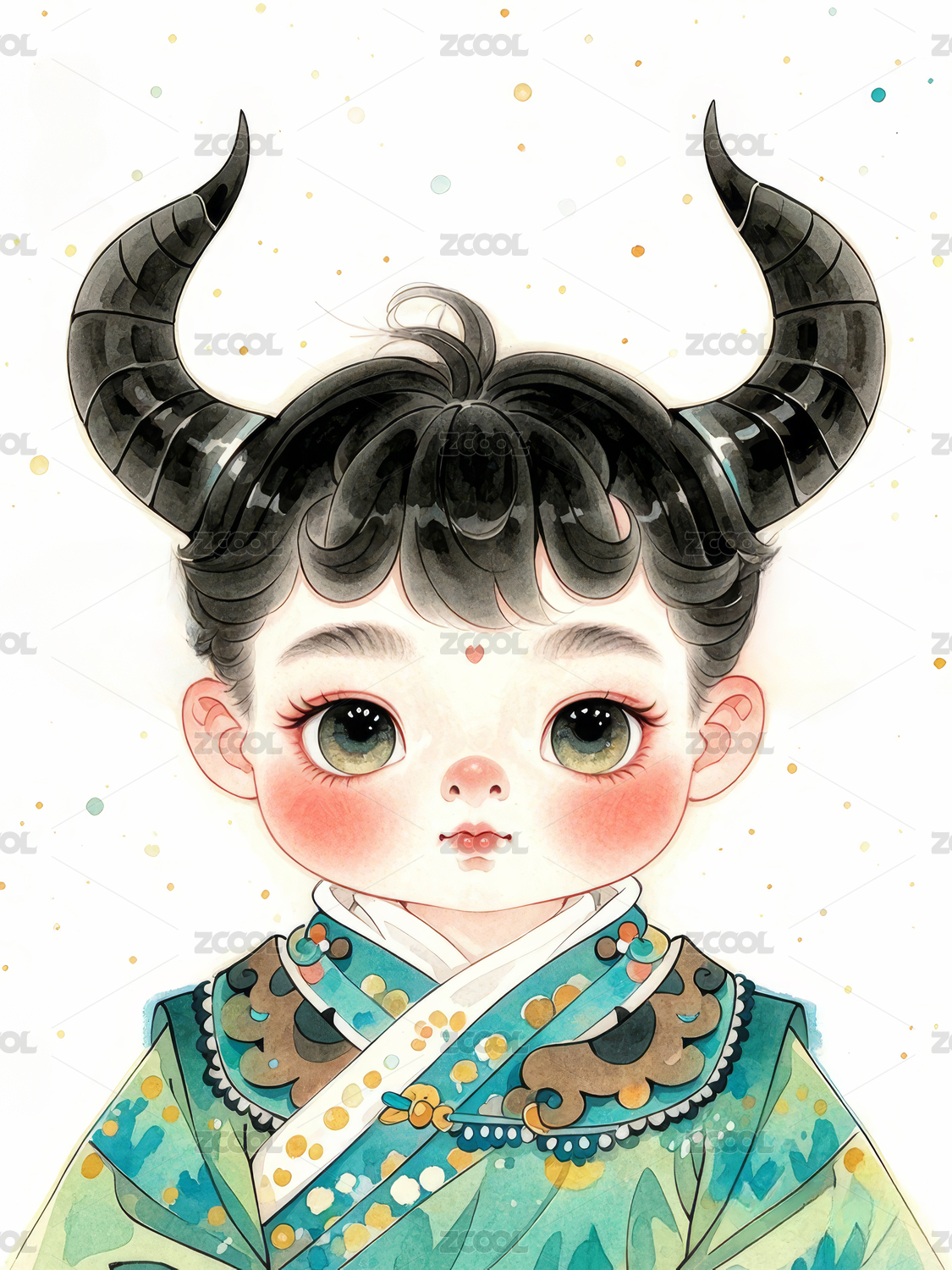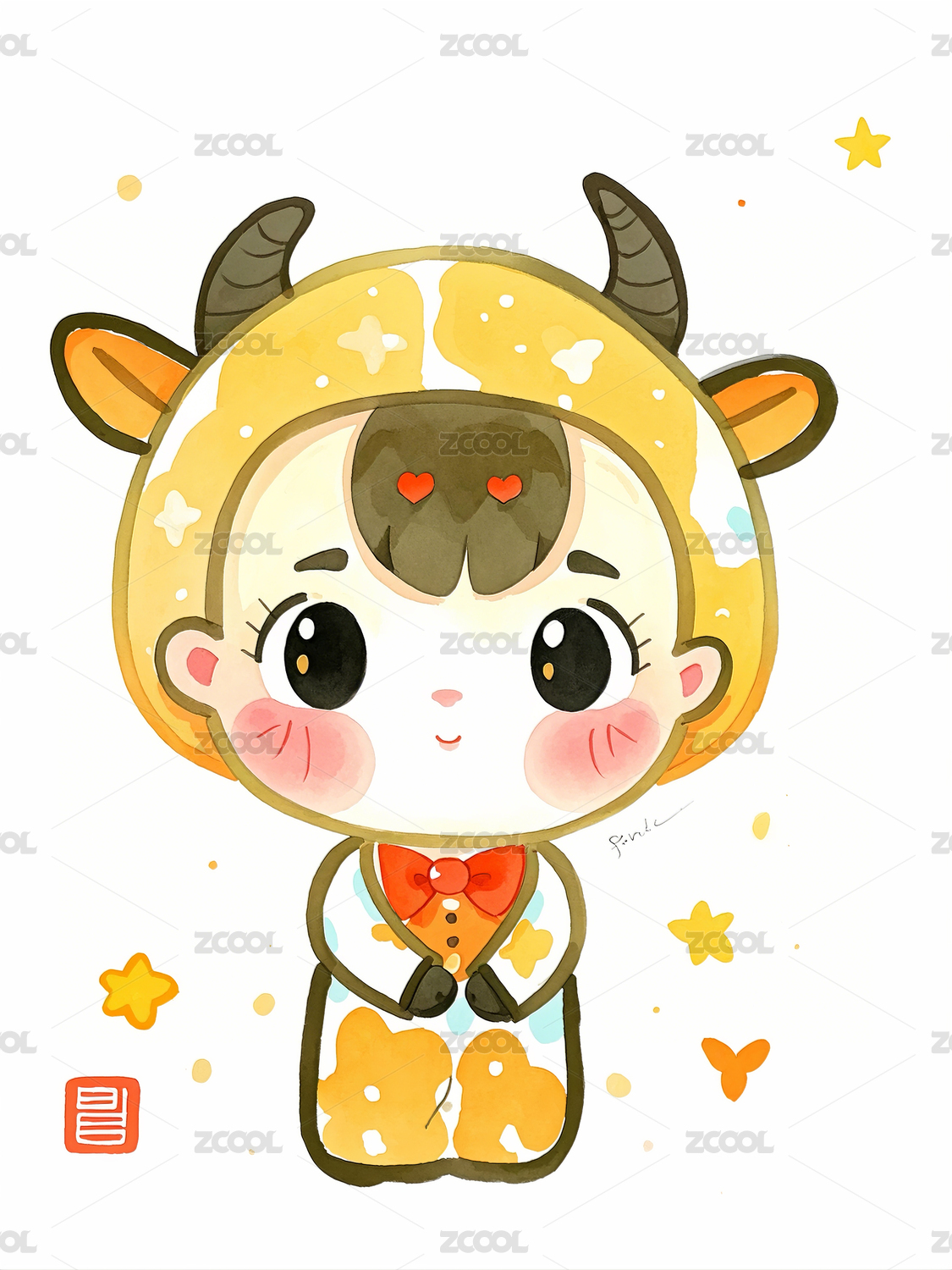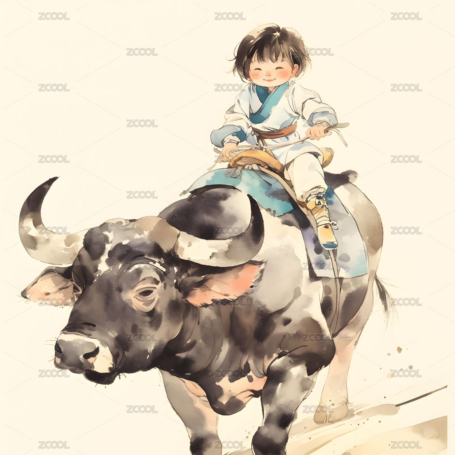 水牛,女孩,生肖,水彩风,可爱