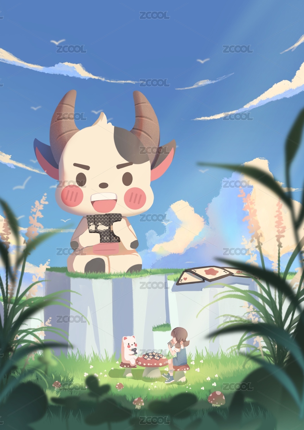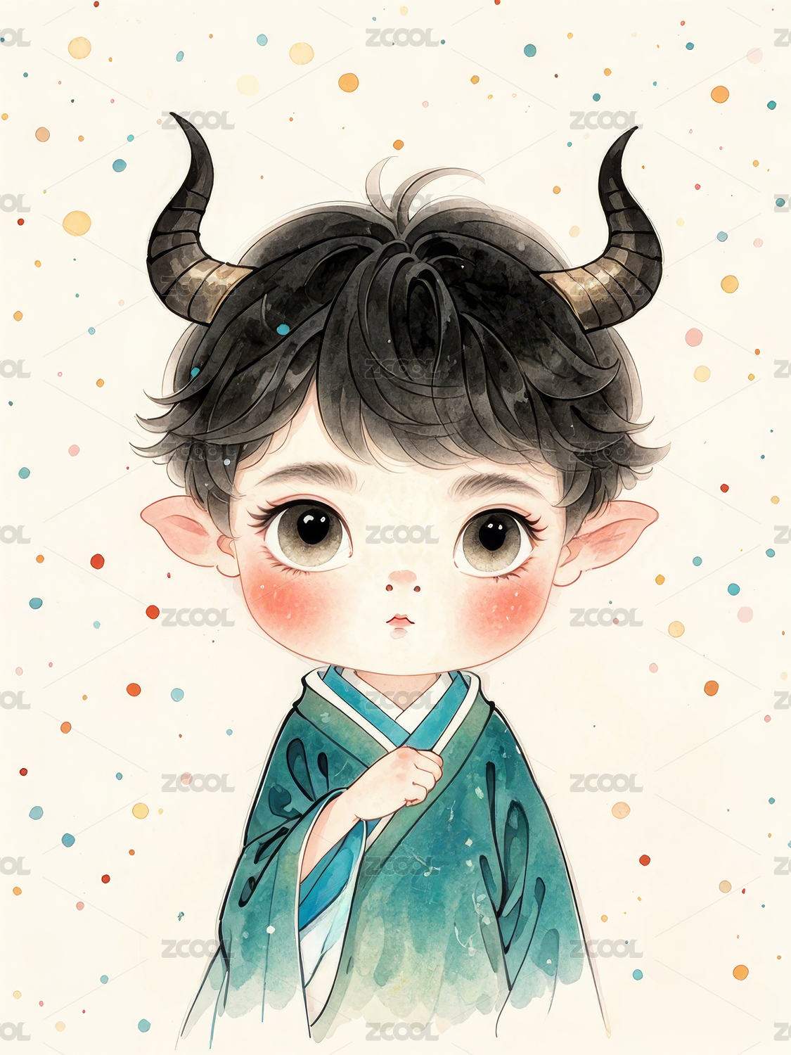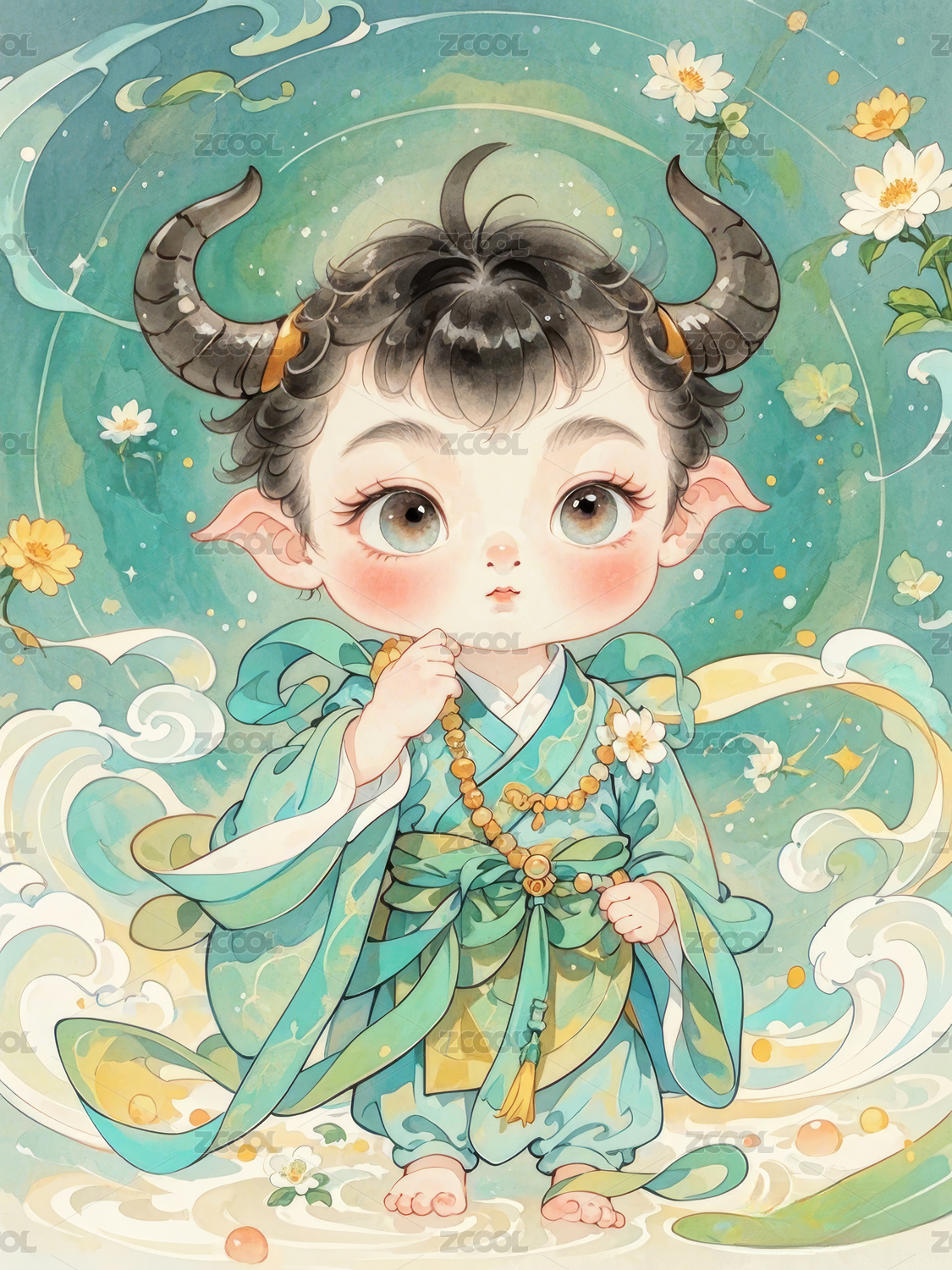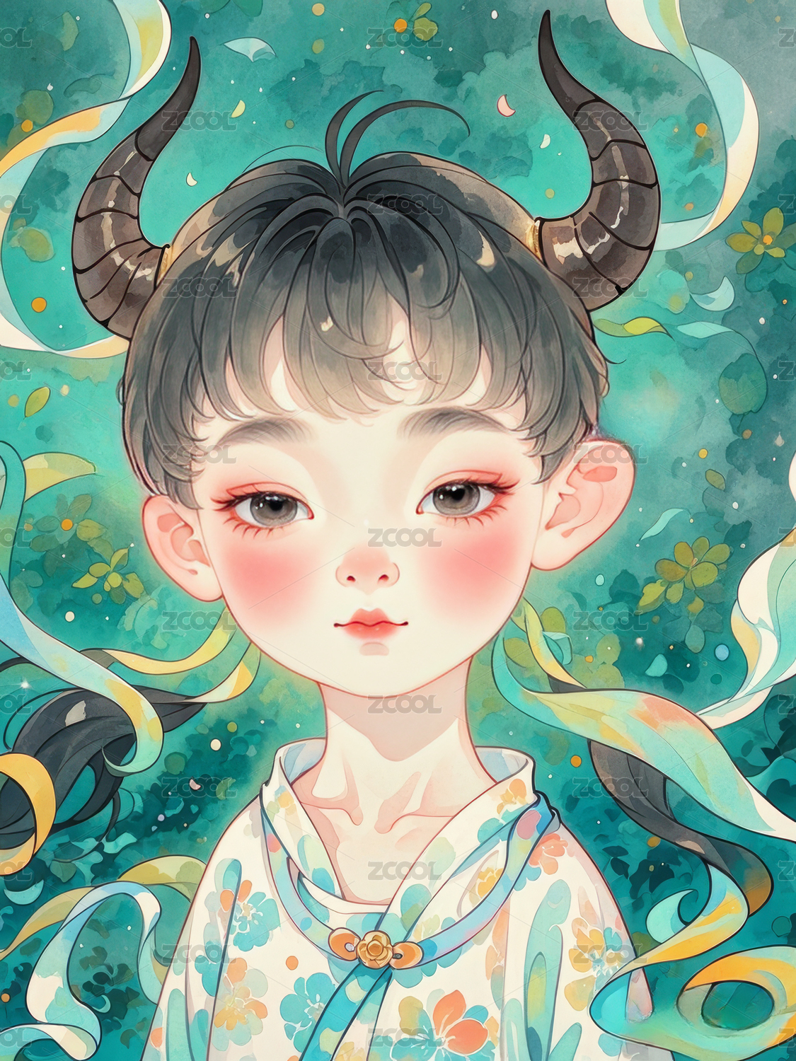 水牛,女孩,生肖,水彩风,可爱