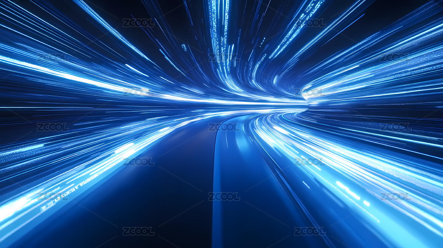 蓝色弯曲弧形放射状发光的光线科技线条背景