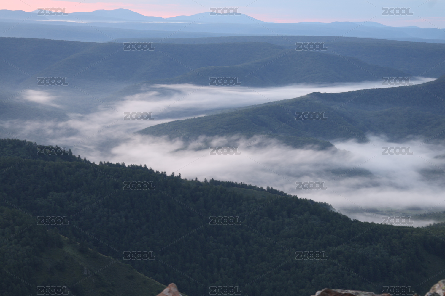 中国内蒙古阿尔山市山区深秋早起云雾雾凇