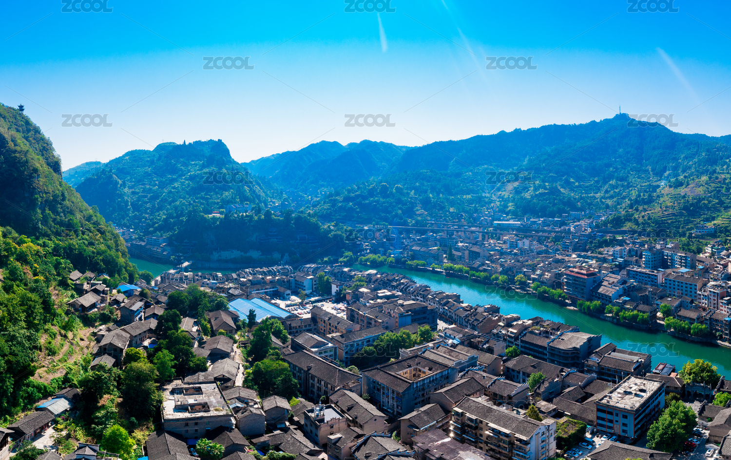贵州省 黔东南州 航拍视角日落时的镇远古