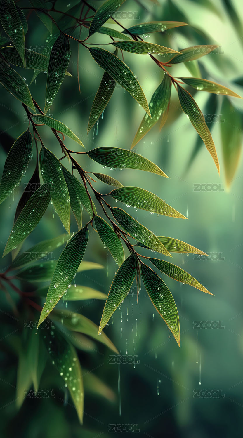 雨中翠绿竹叶画面