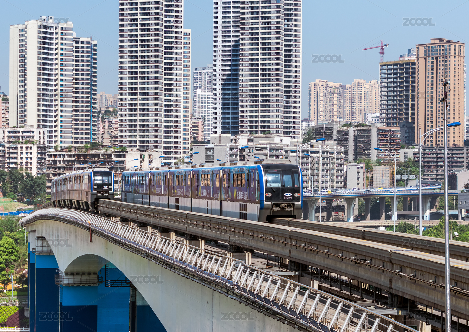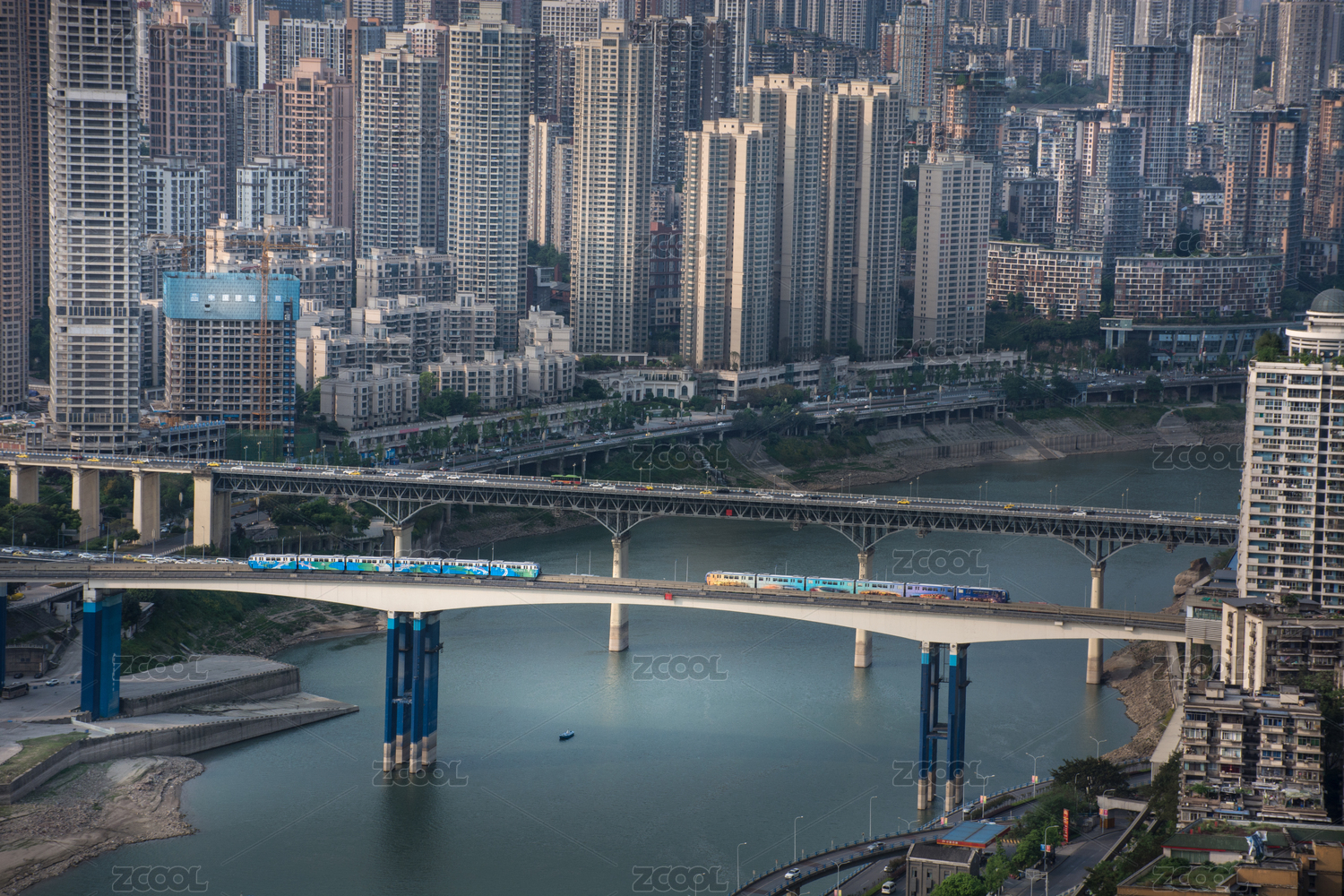 中国重庆两辆轻轨从大桥上穿过繁华的城市