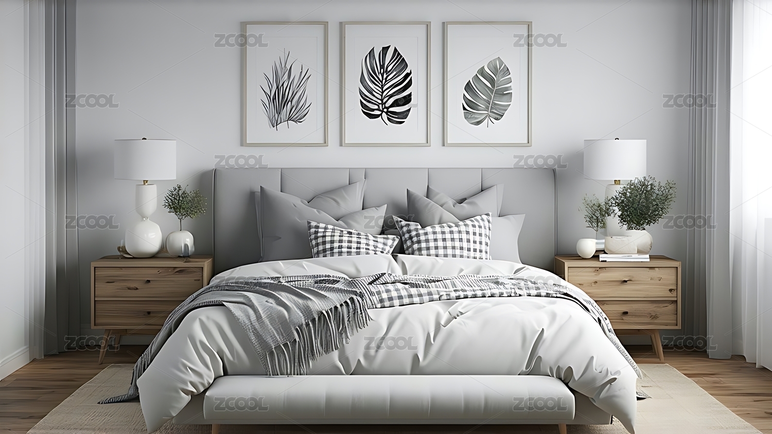 现代简约卧室植物图案装饰画木质家具温馨舒适