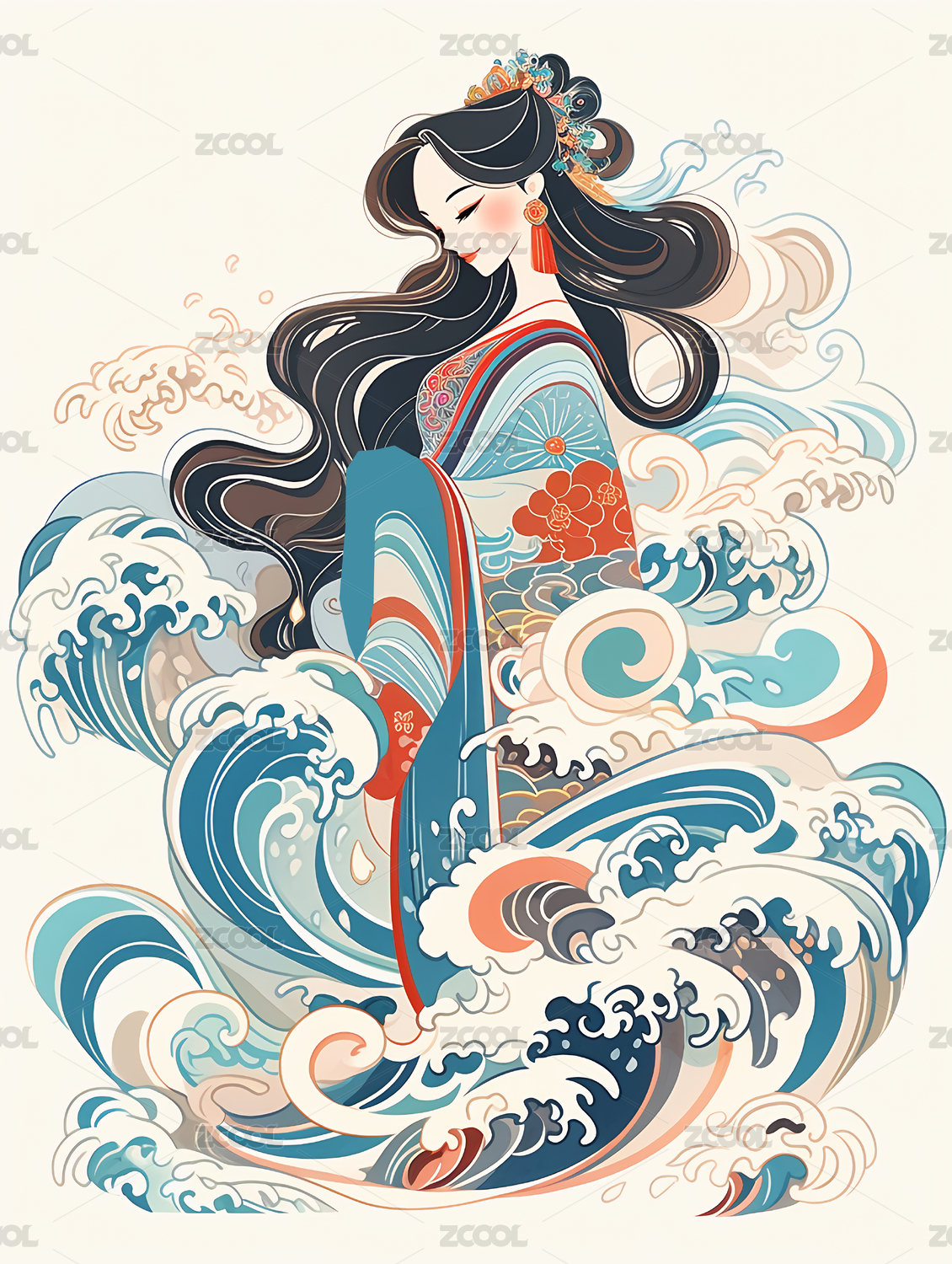 浮世绘,和服,女人,海浪,插画