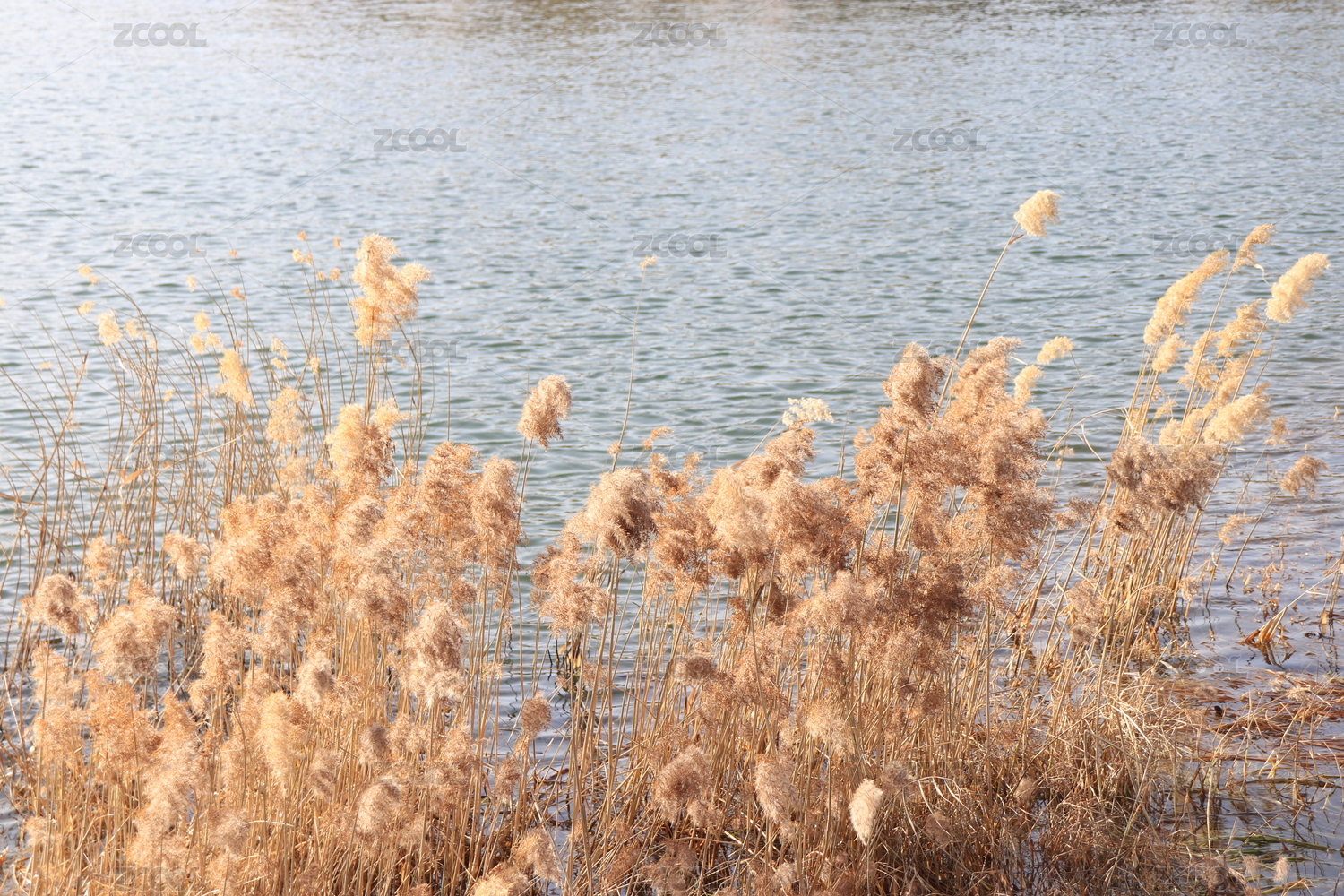 秋天湖边的芦苇丛随风摇曳,展现萧瑟迹象