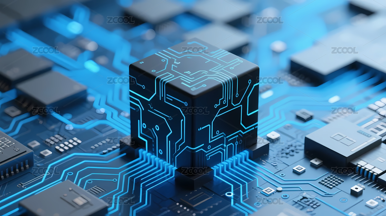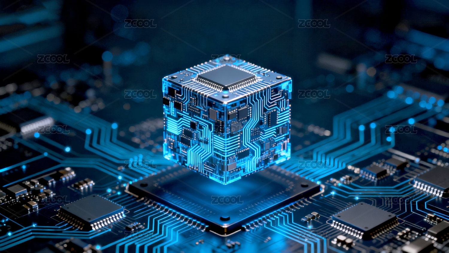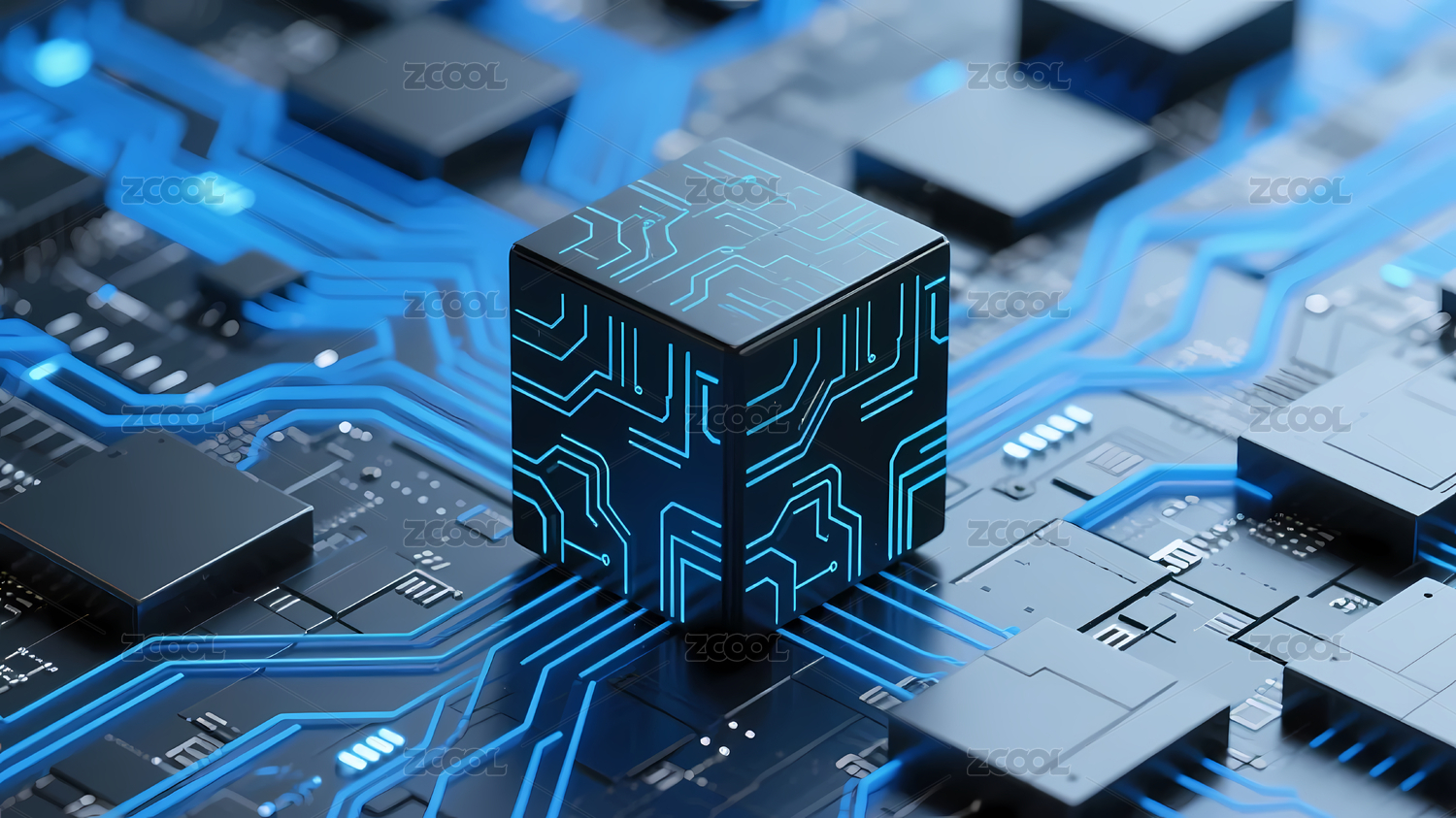 悬浮在深色电路板上方的发光蓝色立方芯片