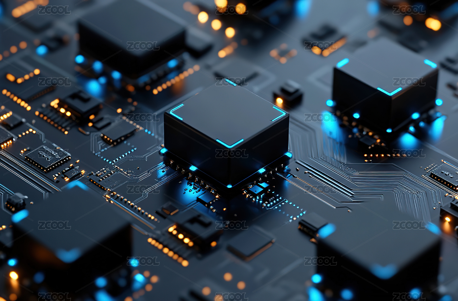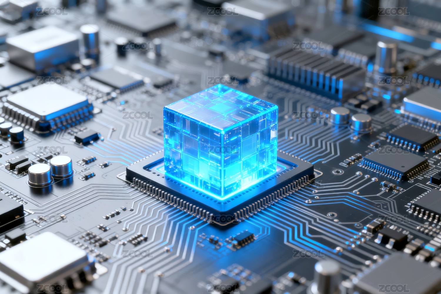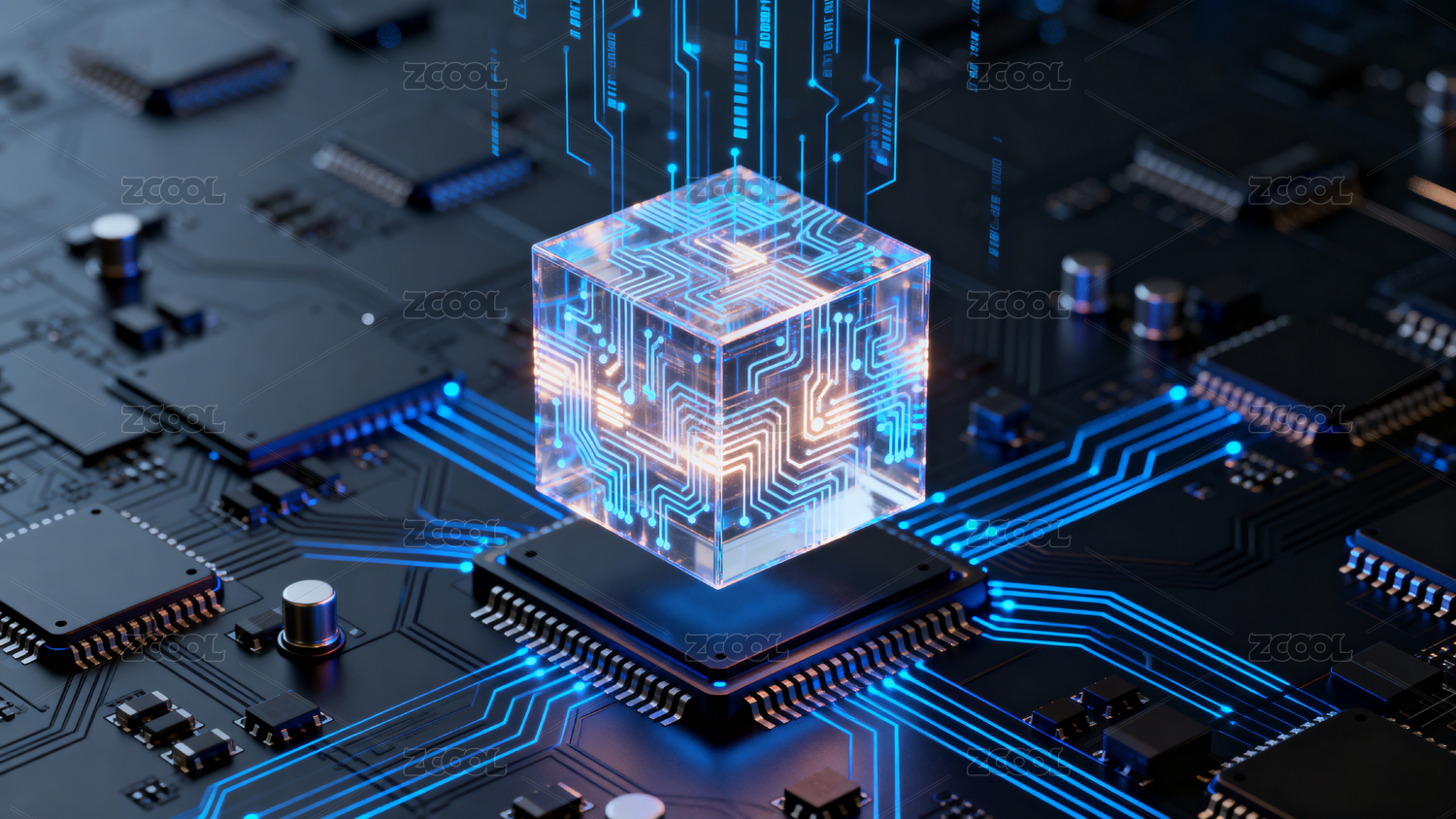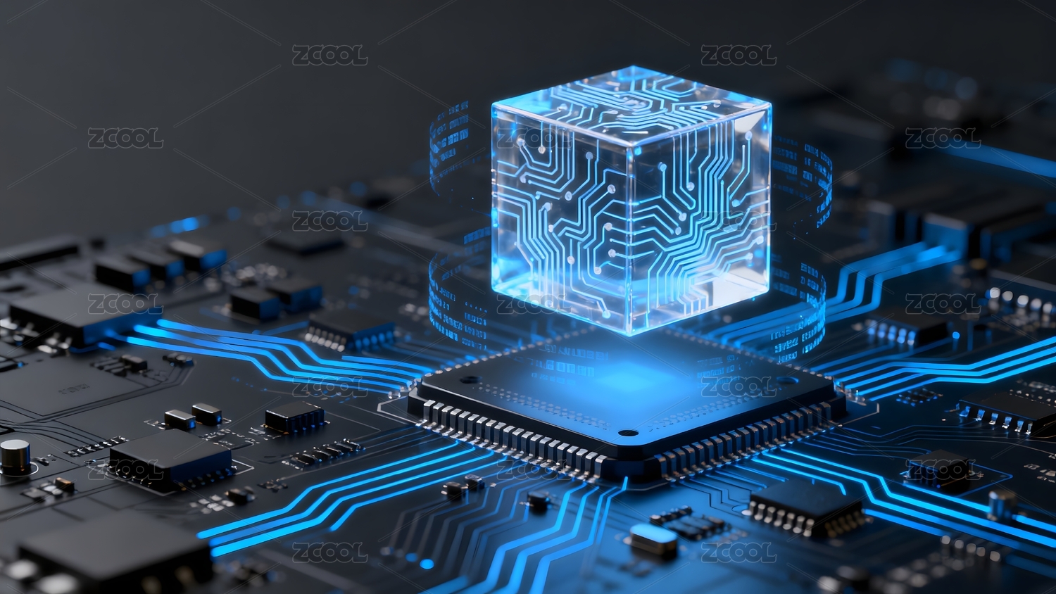 悬浮在深色电路板上方的发光蓝色立方芯片