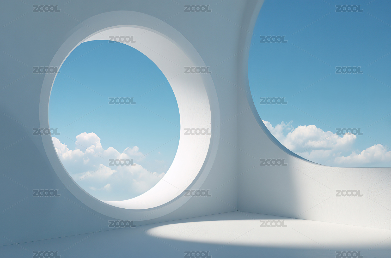 白色室内与圆形窗户3D渲染