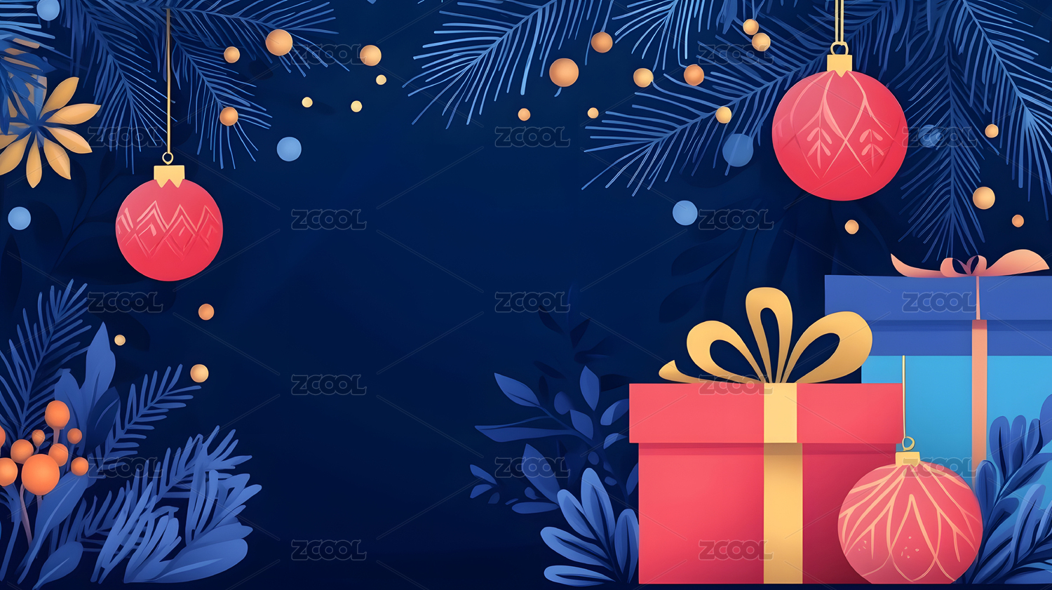 深蓝色调圣诞装饰与礼物