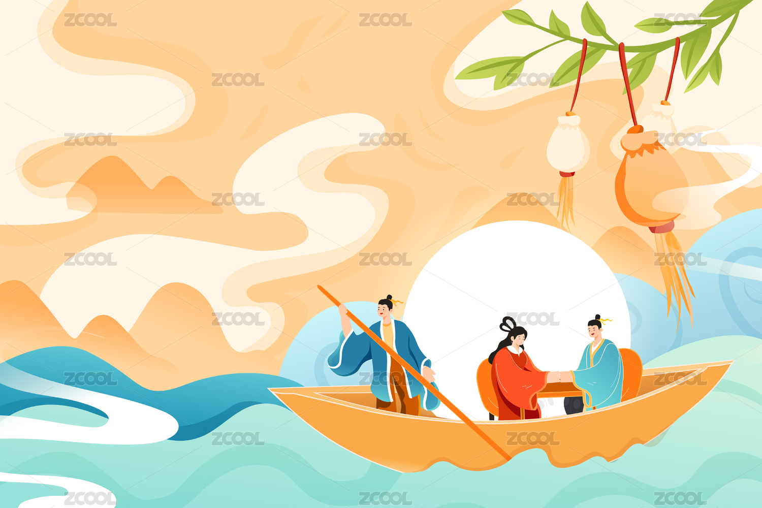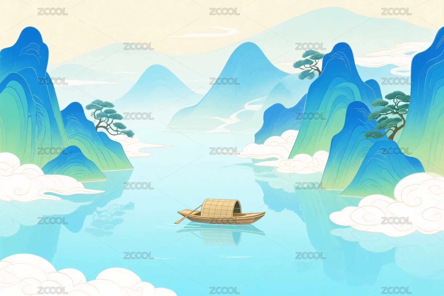 竹林中的湖泊上诗人在小船上举杯吟诗