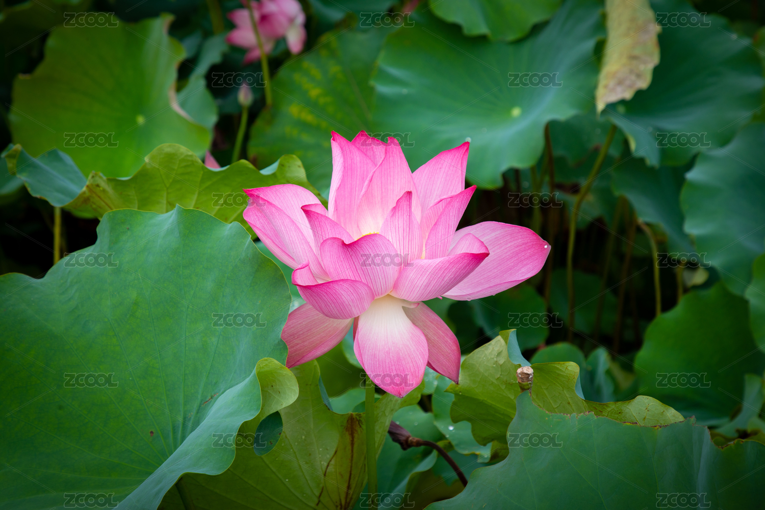 粉红色莲花在绿色荷叶间绽放