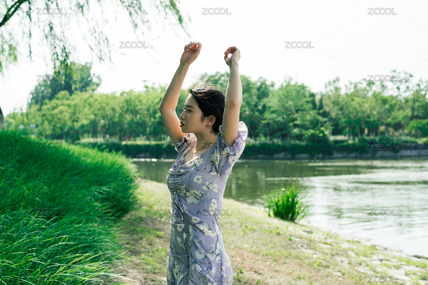 美丽优雅的亚洲女性穿着连衣裙坐在河边