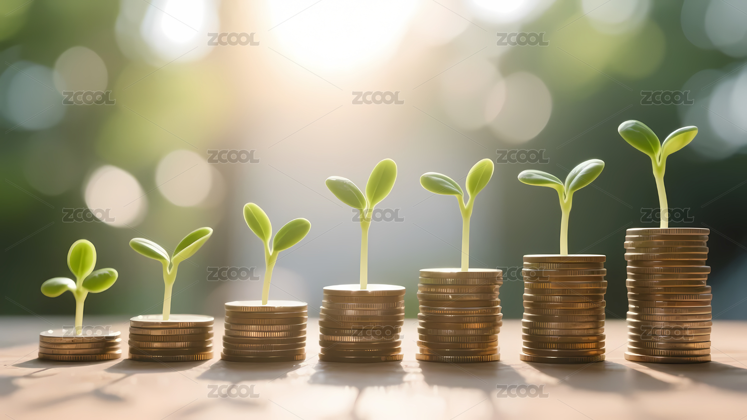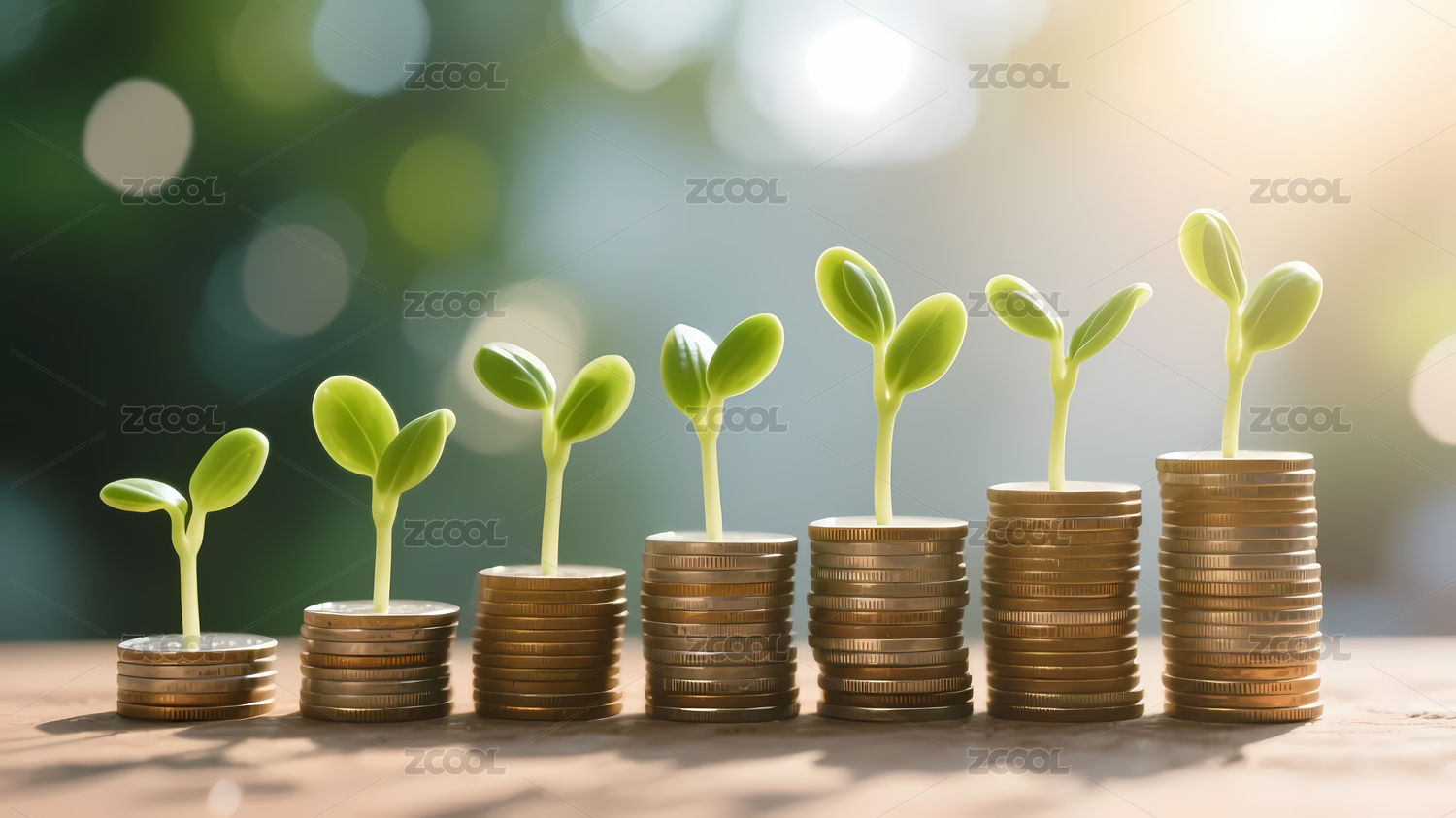 金色的硬币和绿色植物生长照片,储蓄或经济增长概念