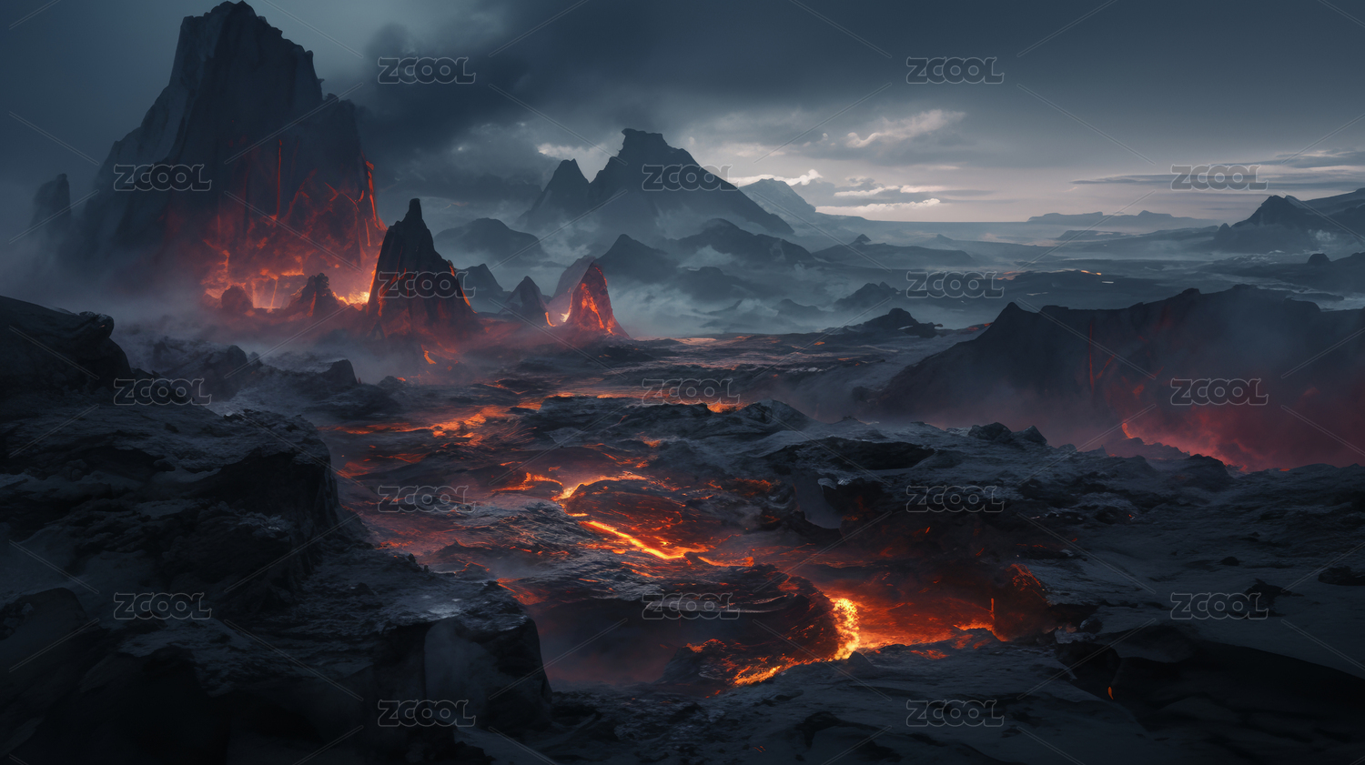 岛屿火山熔浆喷发冰雪流动奇幻超现实大场景