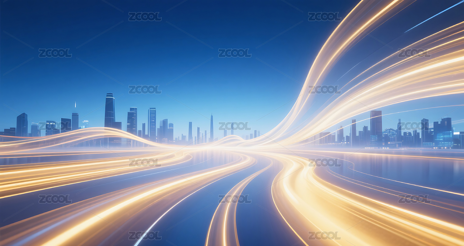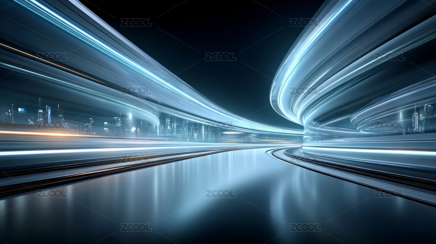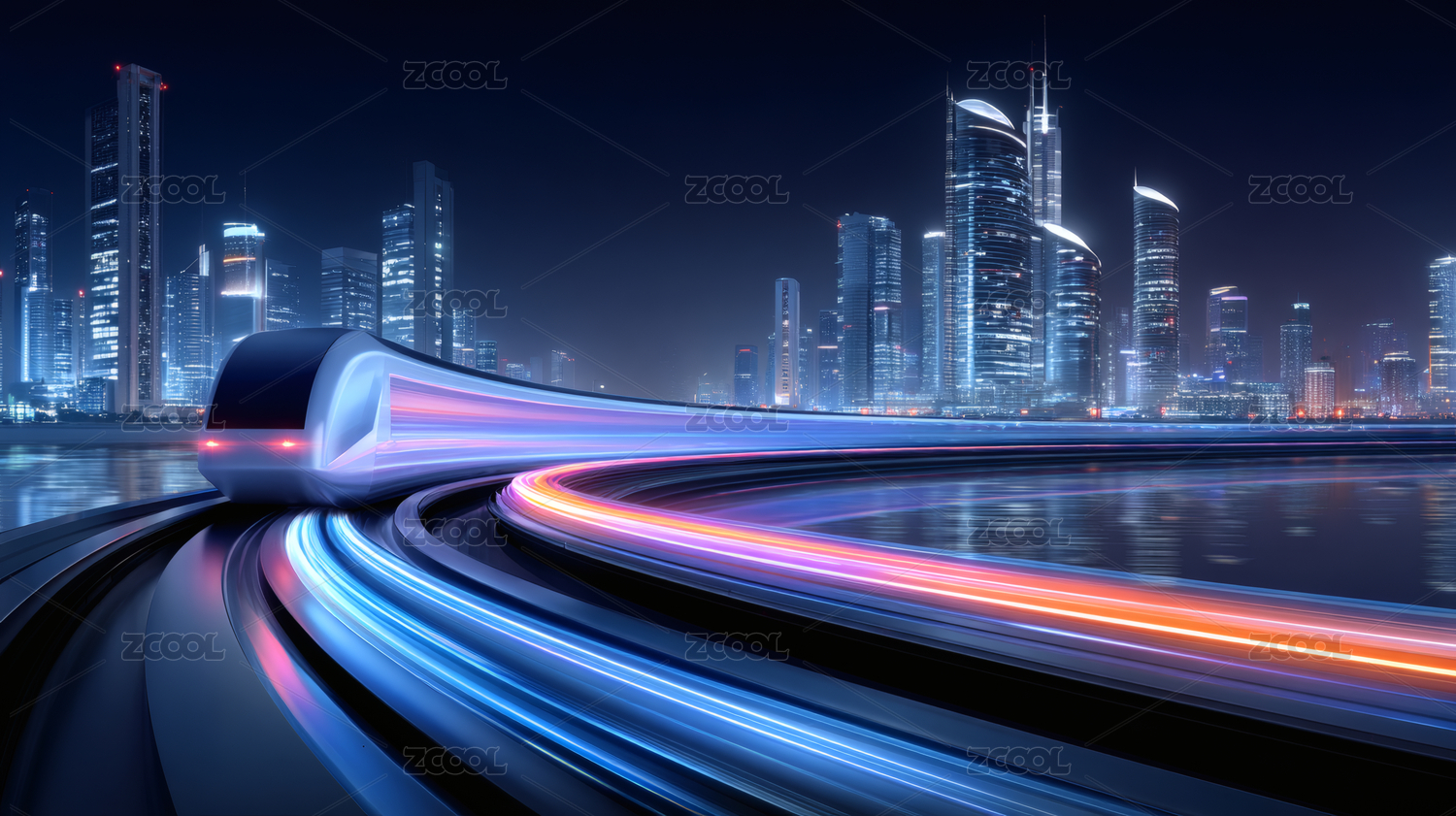 未来感高铁在夜晚的城市旁沿蜿蜒轨道疾驰