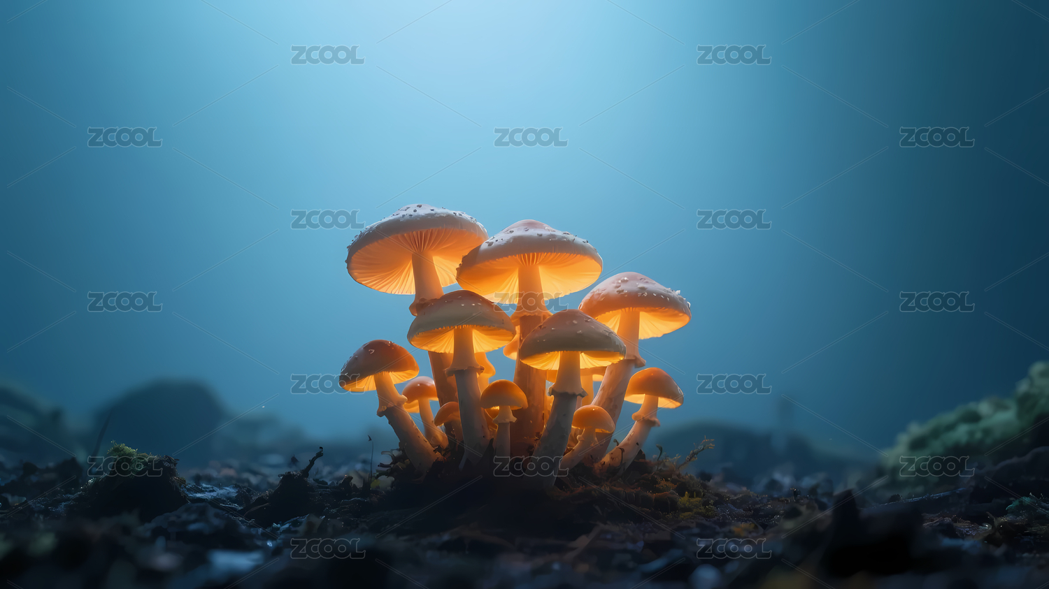 发光蘑菇在深蓝天空下