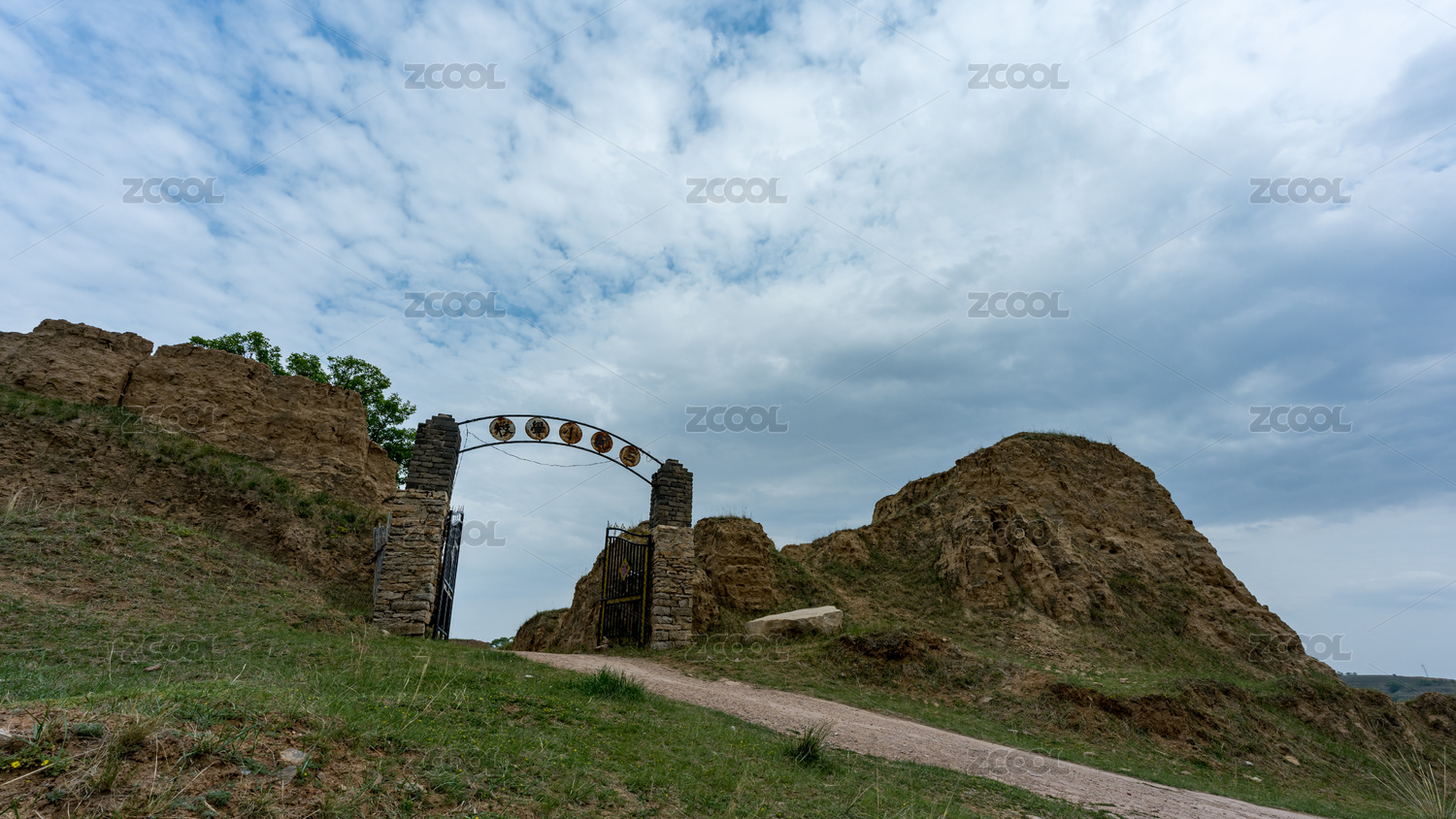 宁夏,银川市,镇北堡西部影视城,天空,城墙,旗帜,黄土,云,无人,户外