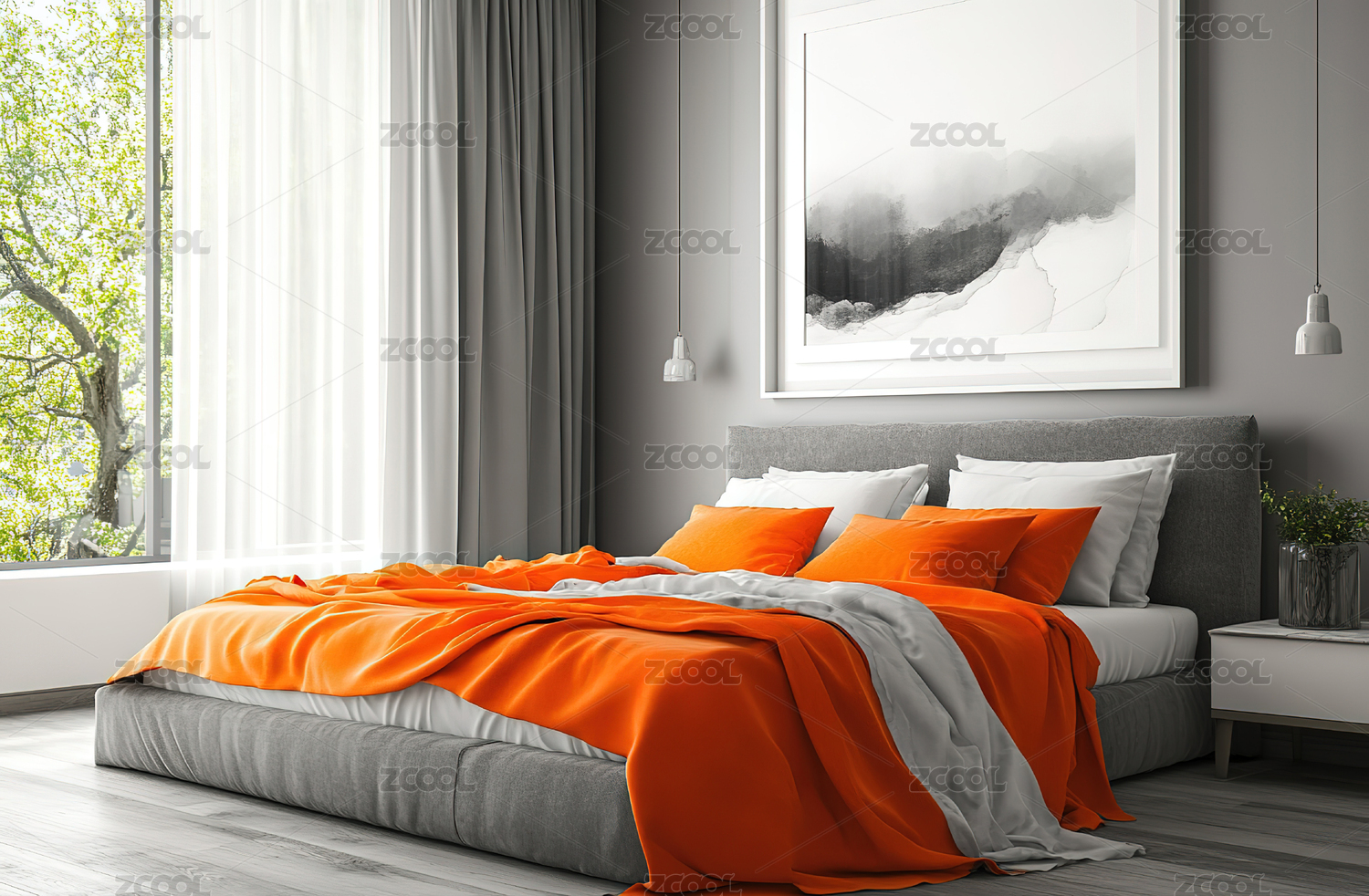床,被子,枕头,床单,窗帘,地板,木地板,壁画,桌子,台灯