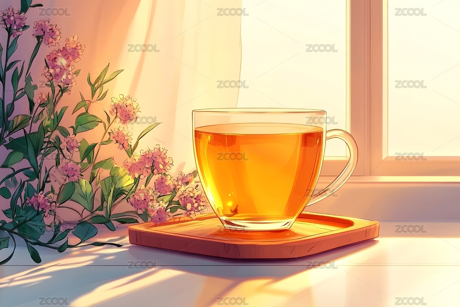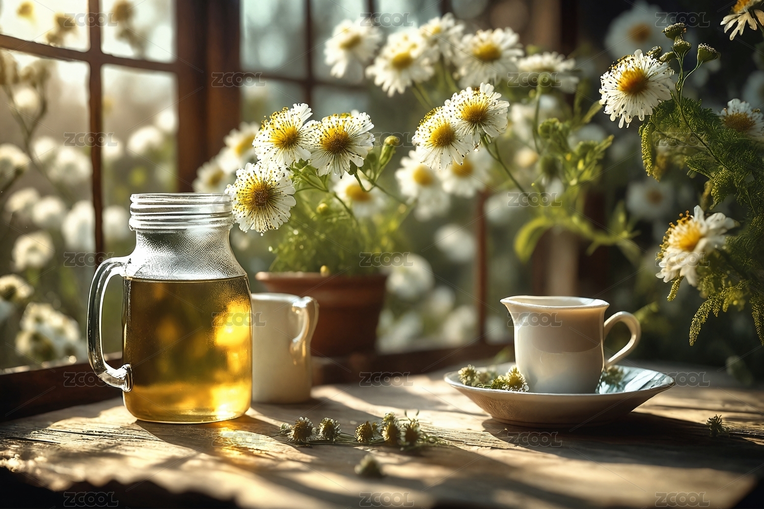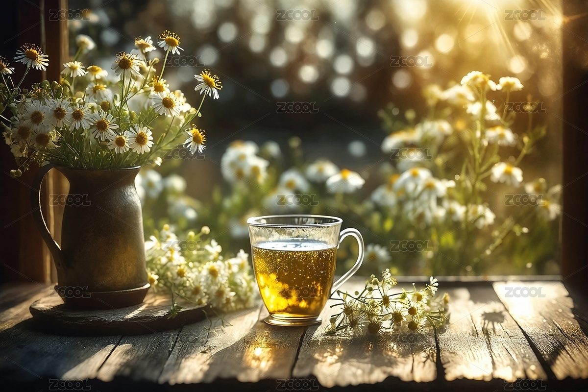 阳光,茶杯,甘菊花,杯子,桌子,窗户,光线,温暖,宁静,自然