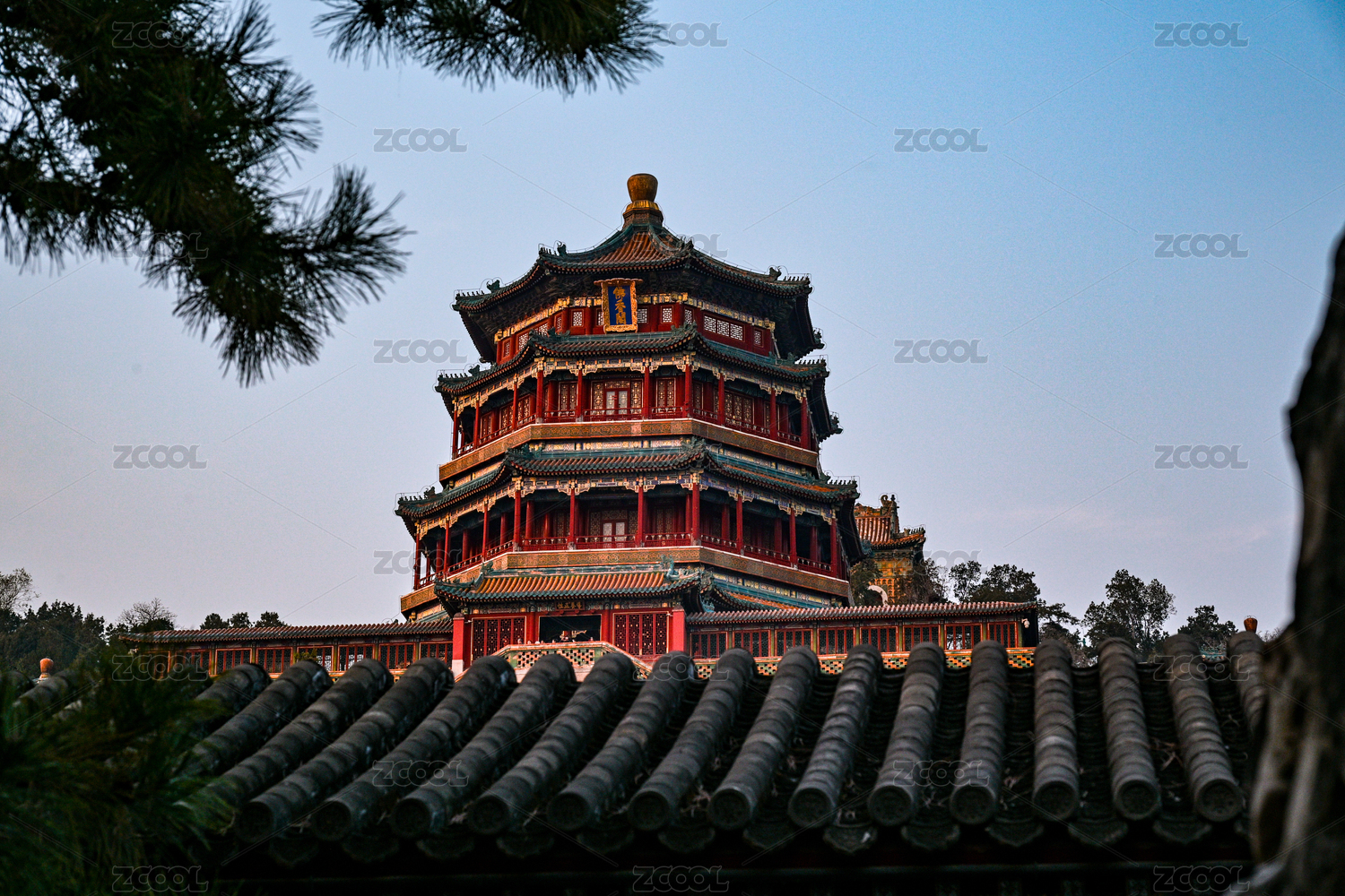 秋天夕阳下的北京颐和园公园的佛香阁古宫殿