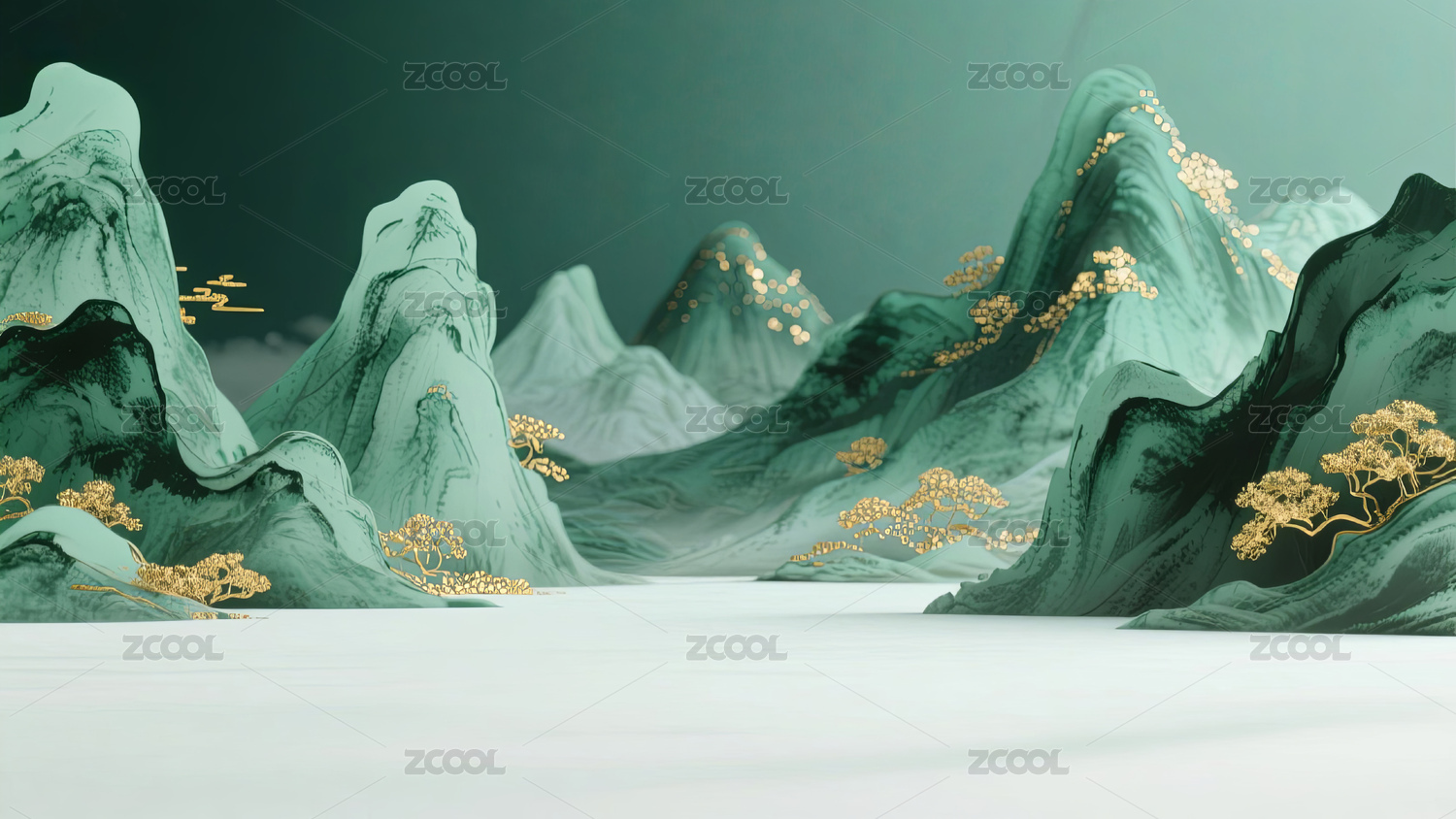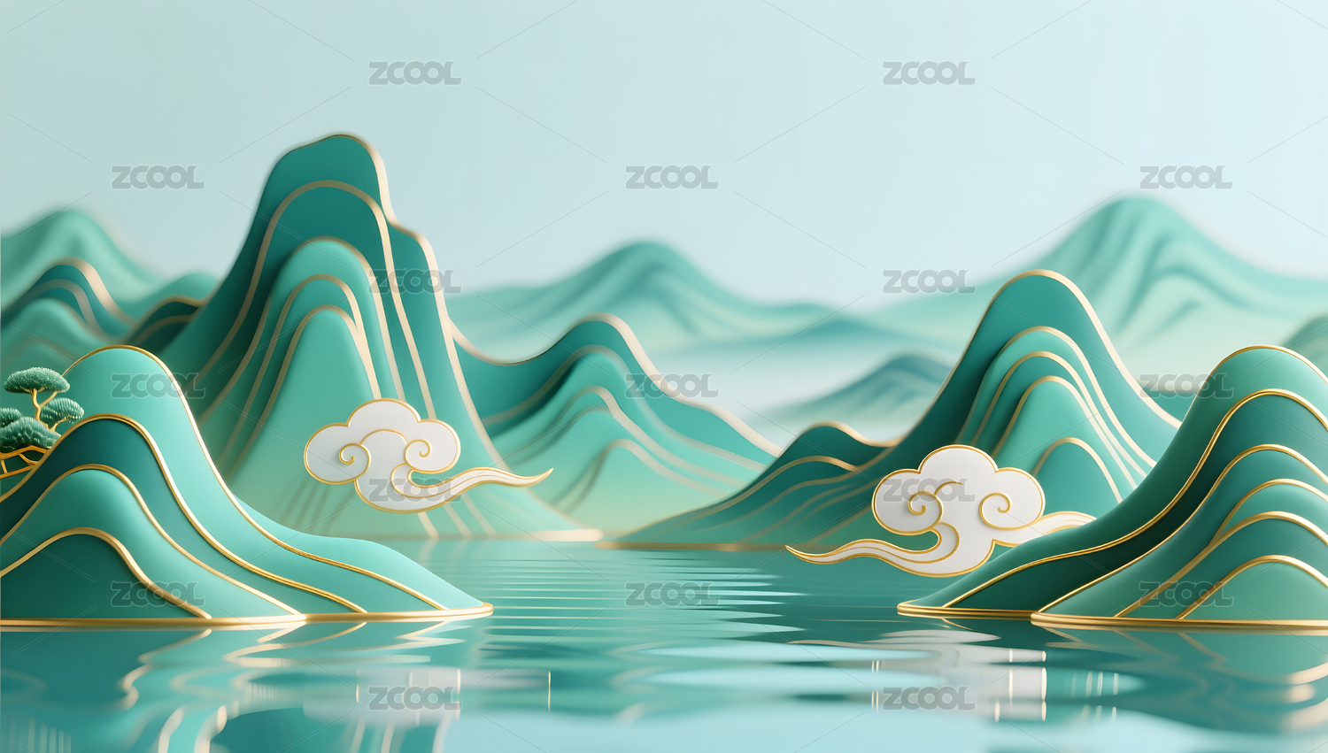 有亭台楼阁小桥流水的仙境绿色山水3D卡通