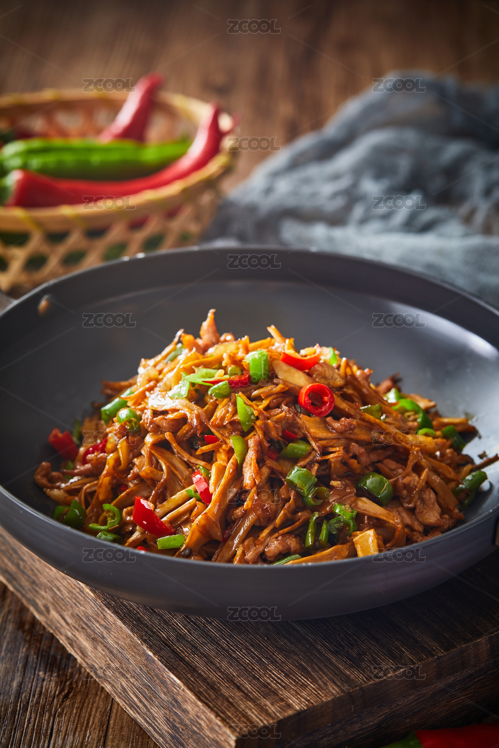 木纹背景上餐盒里盛放的鱼香肉丝饭