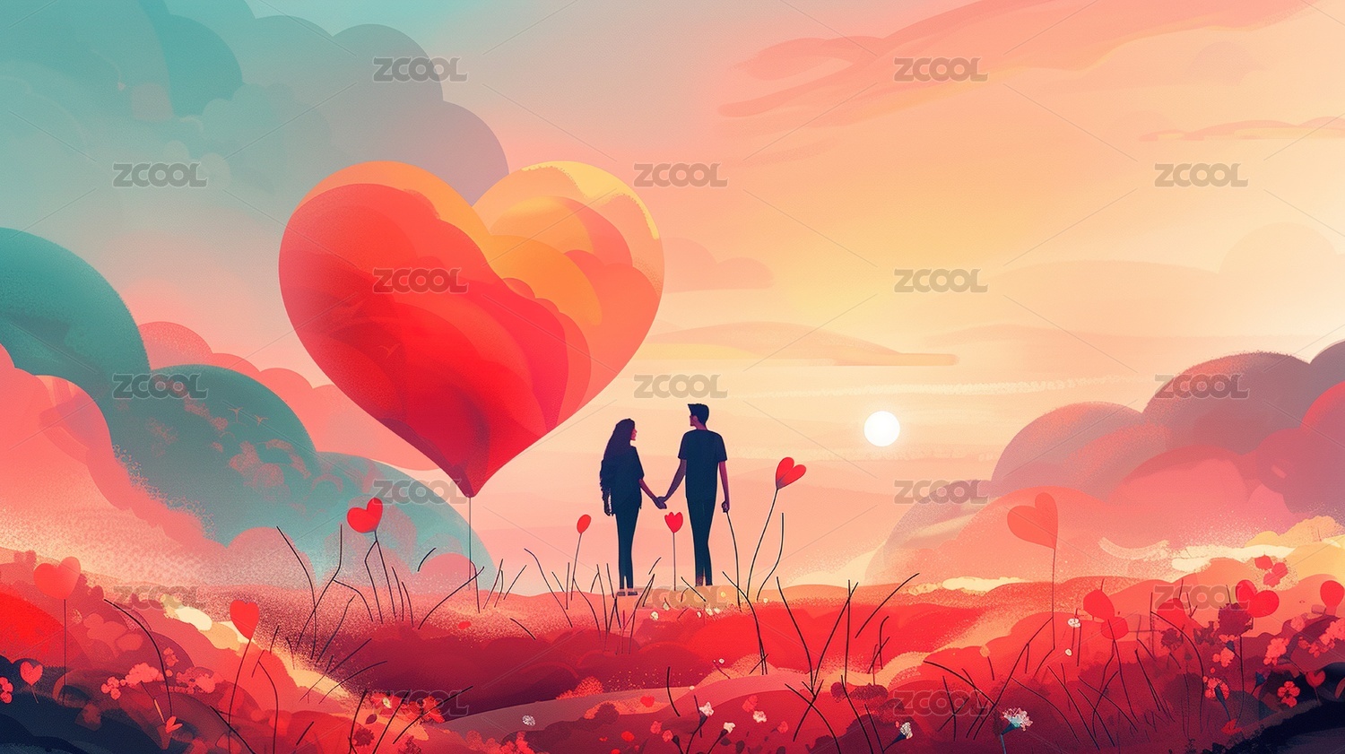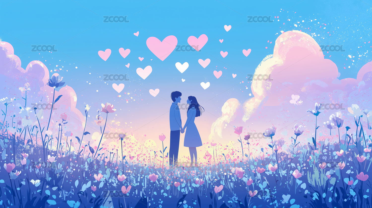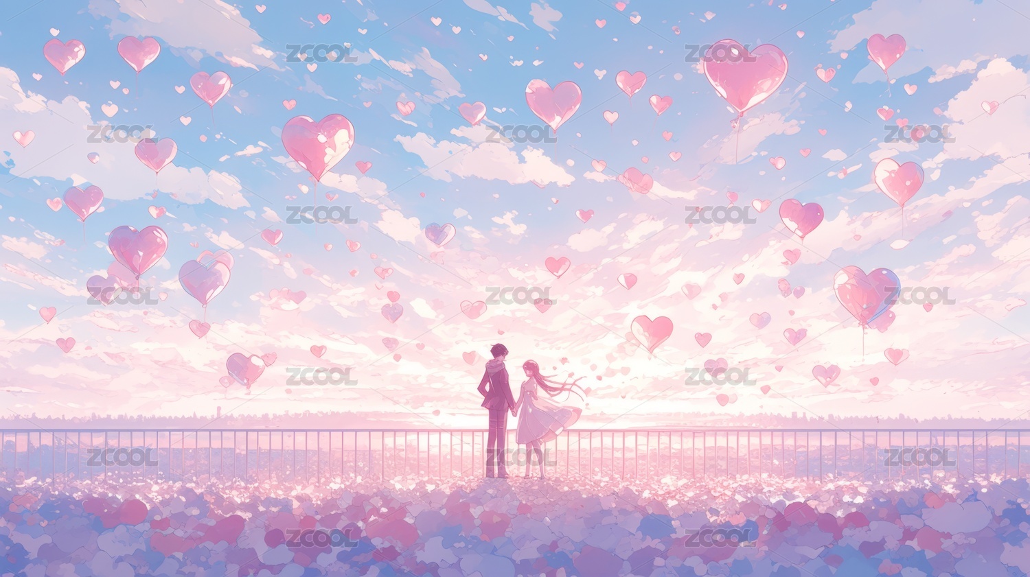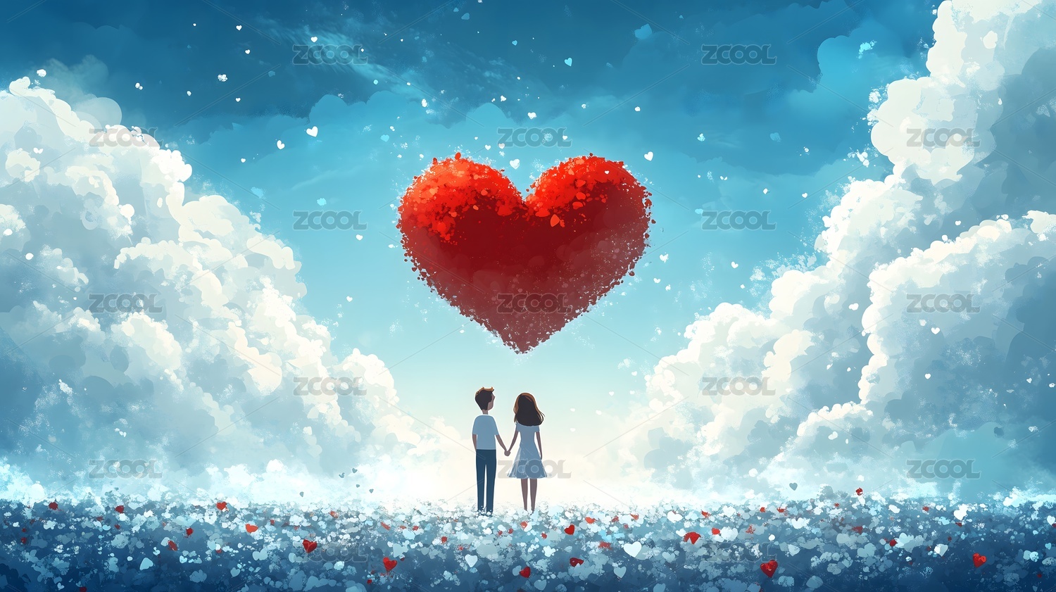 情侣,爱心,插画,浪漫,唯美,温暖,天空,氛围,云,清新