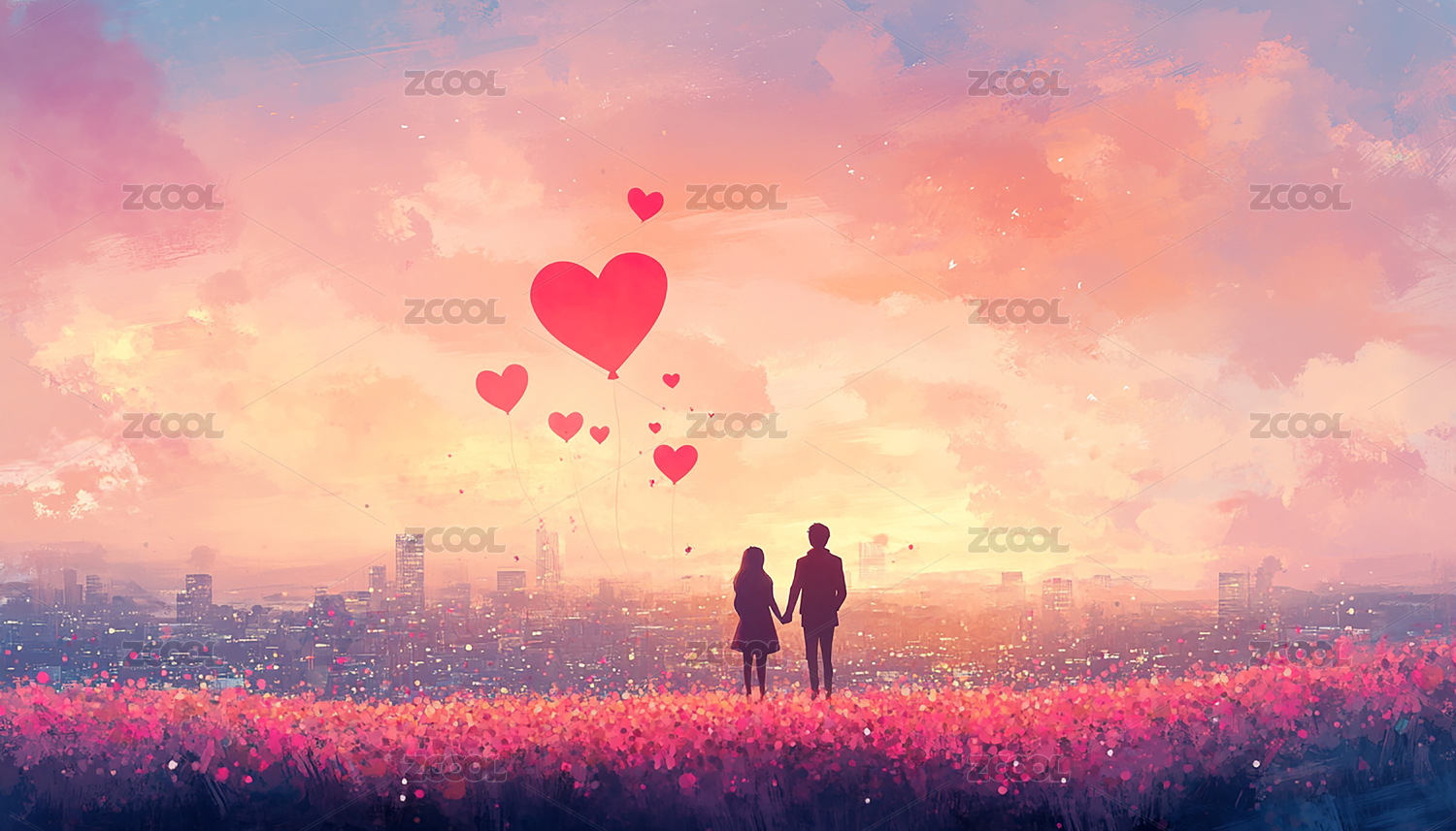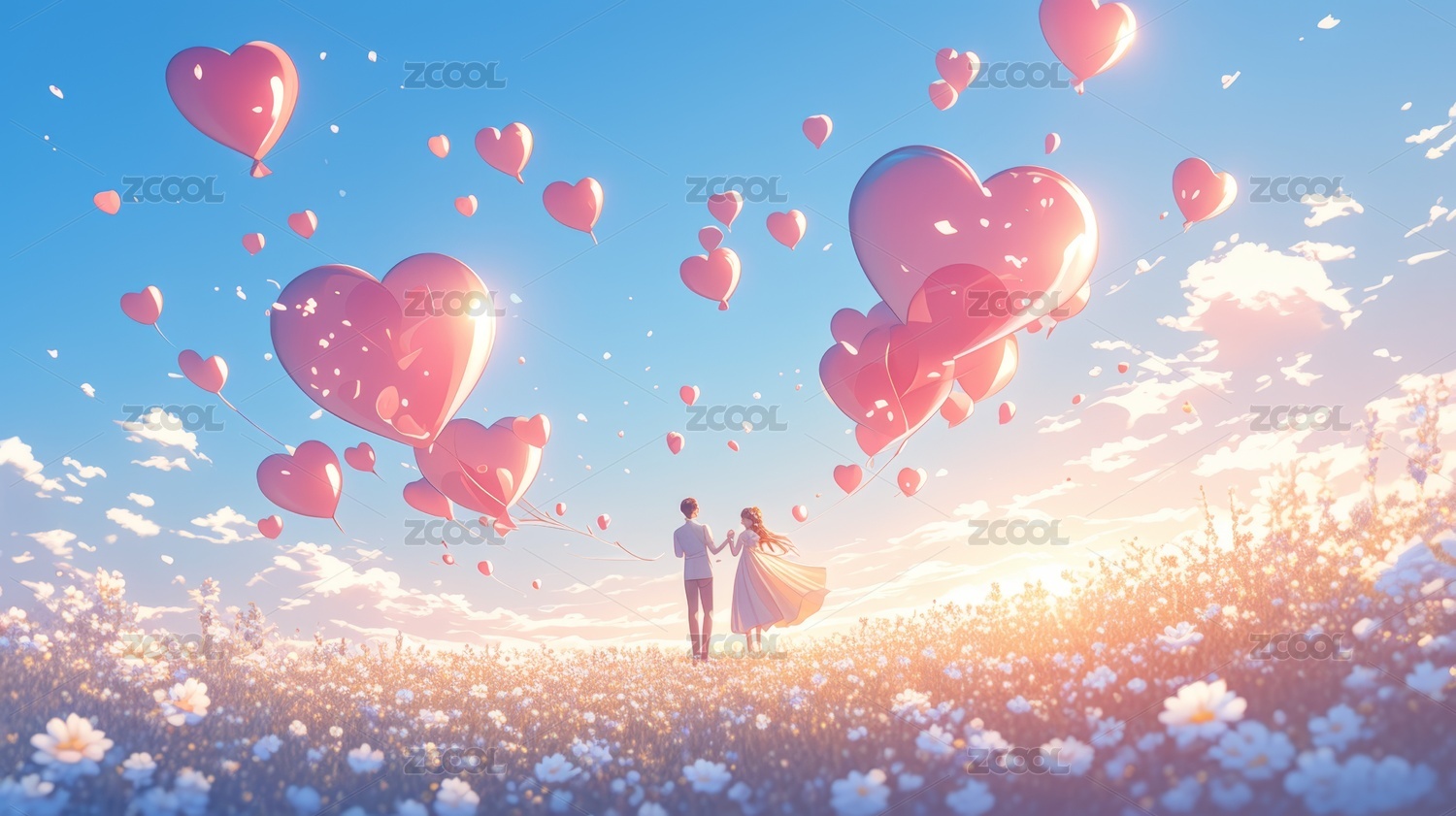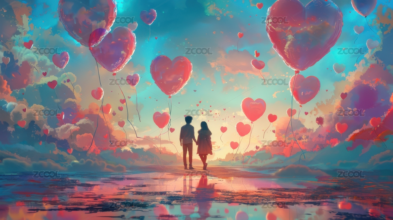 情侣,爱心,插画,浪漫,唯美,温暖,天空,氛围,云,清新