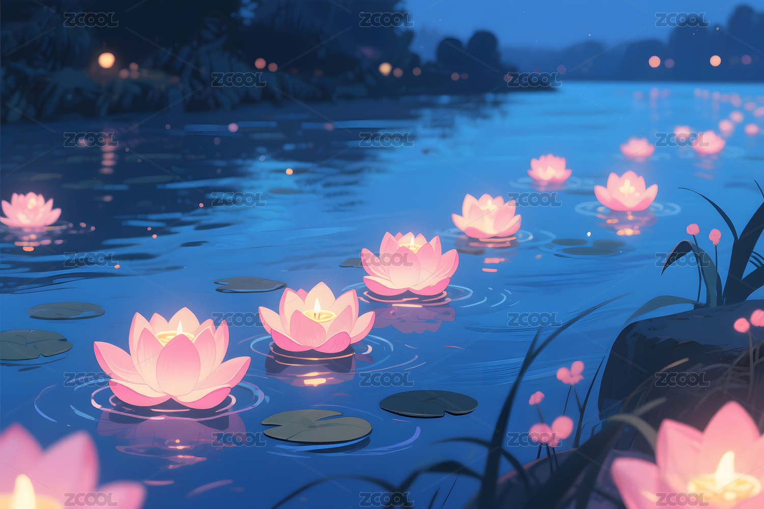 湖面荷花灯夜景