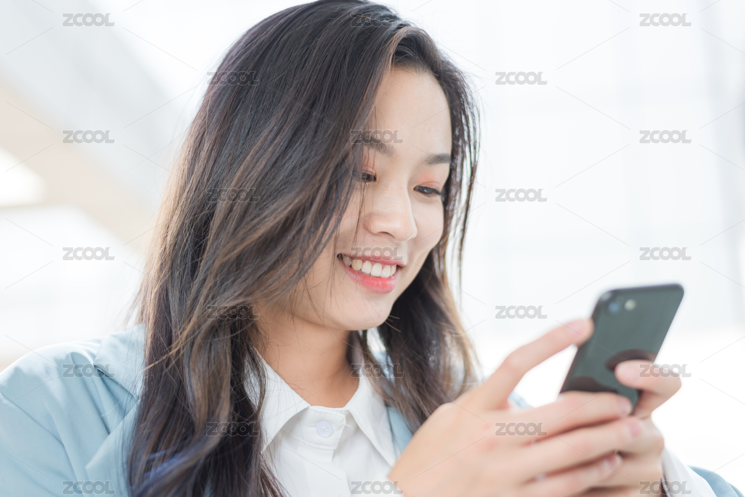 一个中国女抓住坐在休闲区用手机和别人沟通