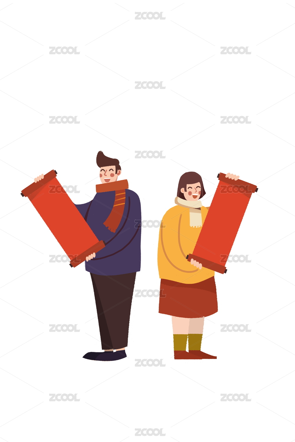 卡通手绘2020年新年男女手持春联闪屏海报插画
