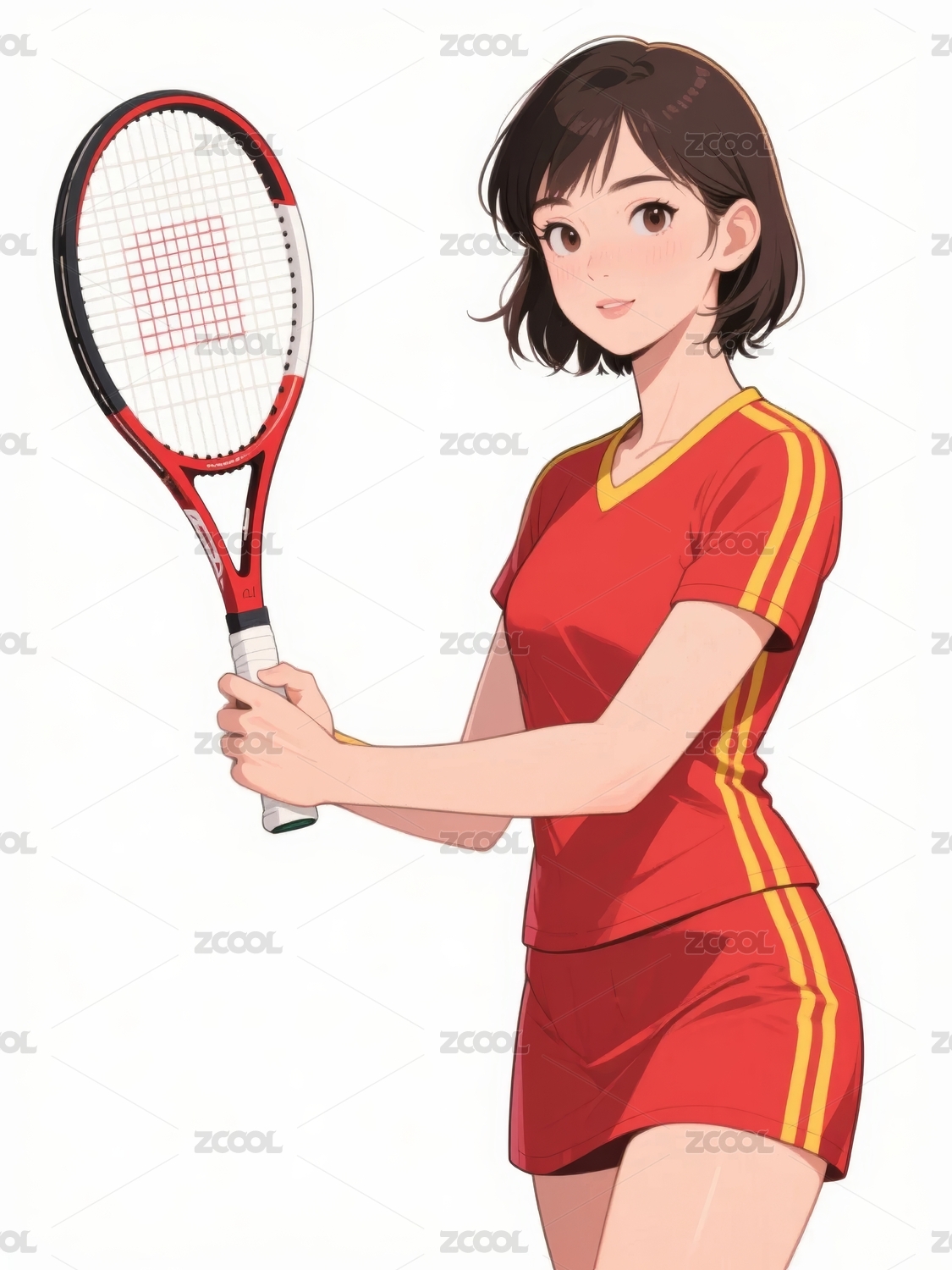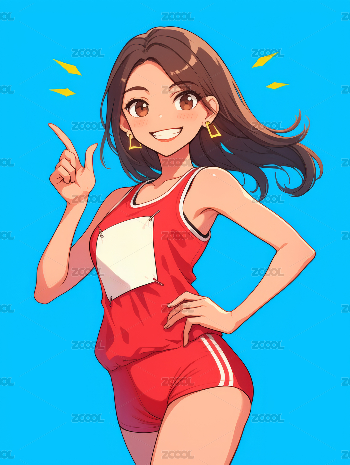 AIGC202401,运动,女孩,白色背景,插画,长发,高马尾,平视,全身像,蹲下