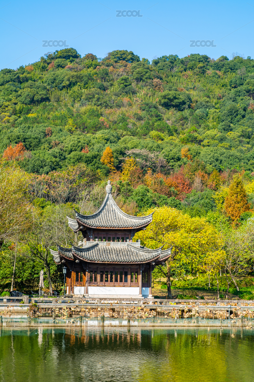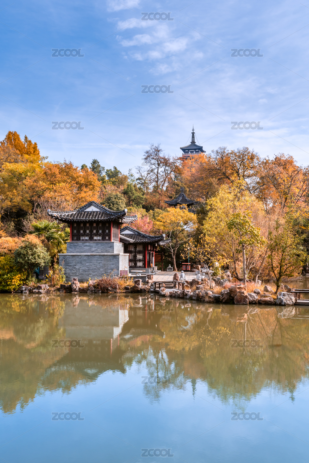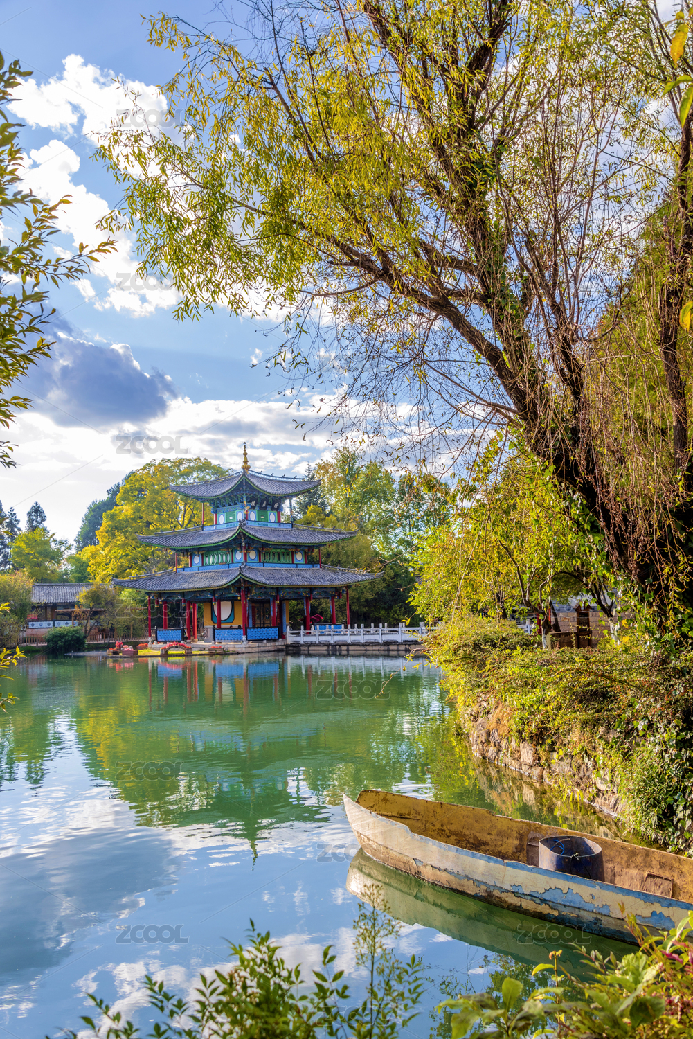 中国云南丽江黑龙潭公园湖泊秋色古建筑风光