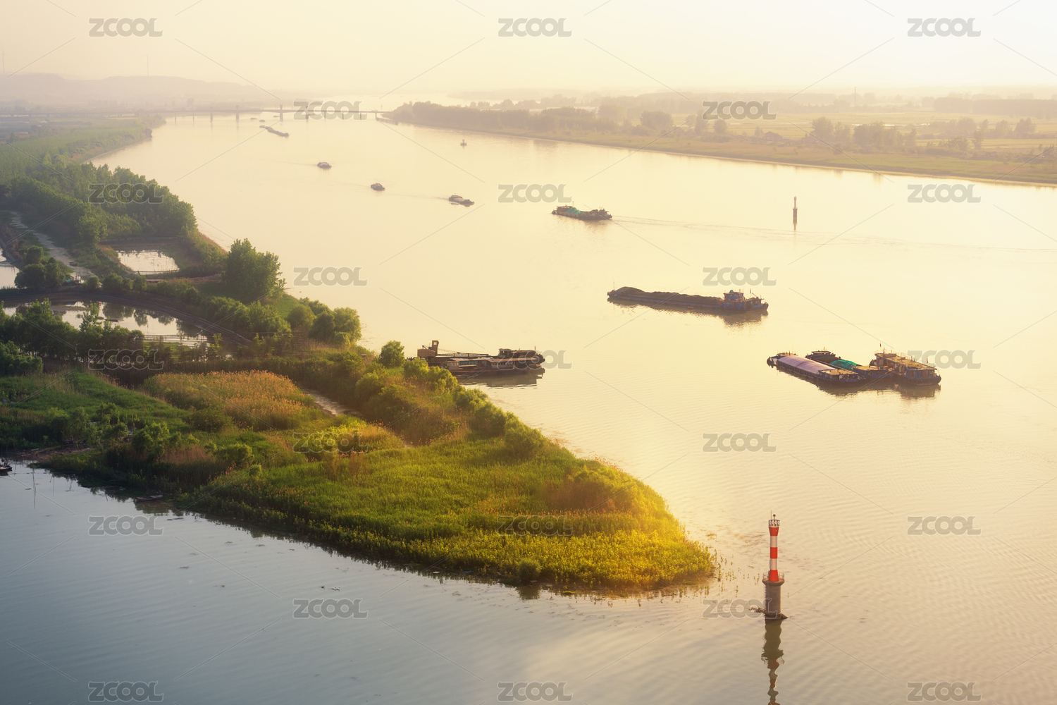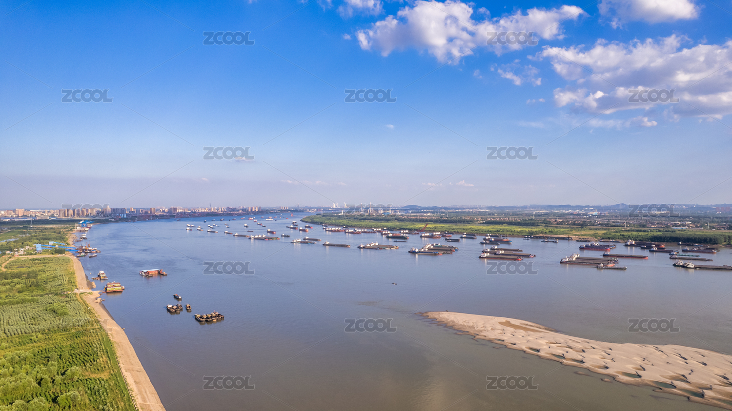 中国湖北武汉天兴洲退水露出的浅滩与远处的货船