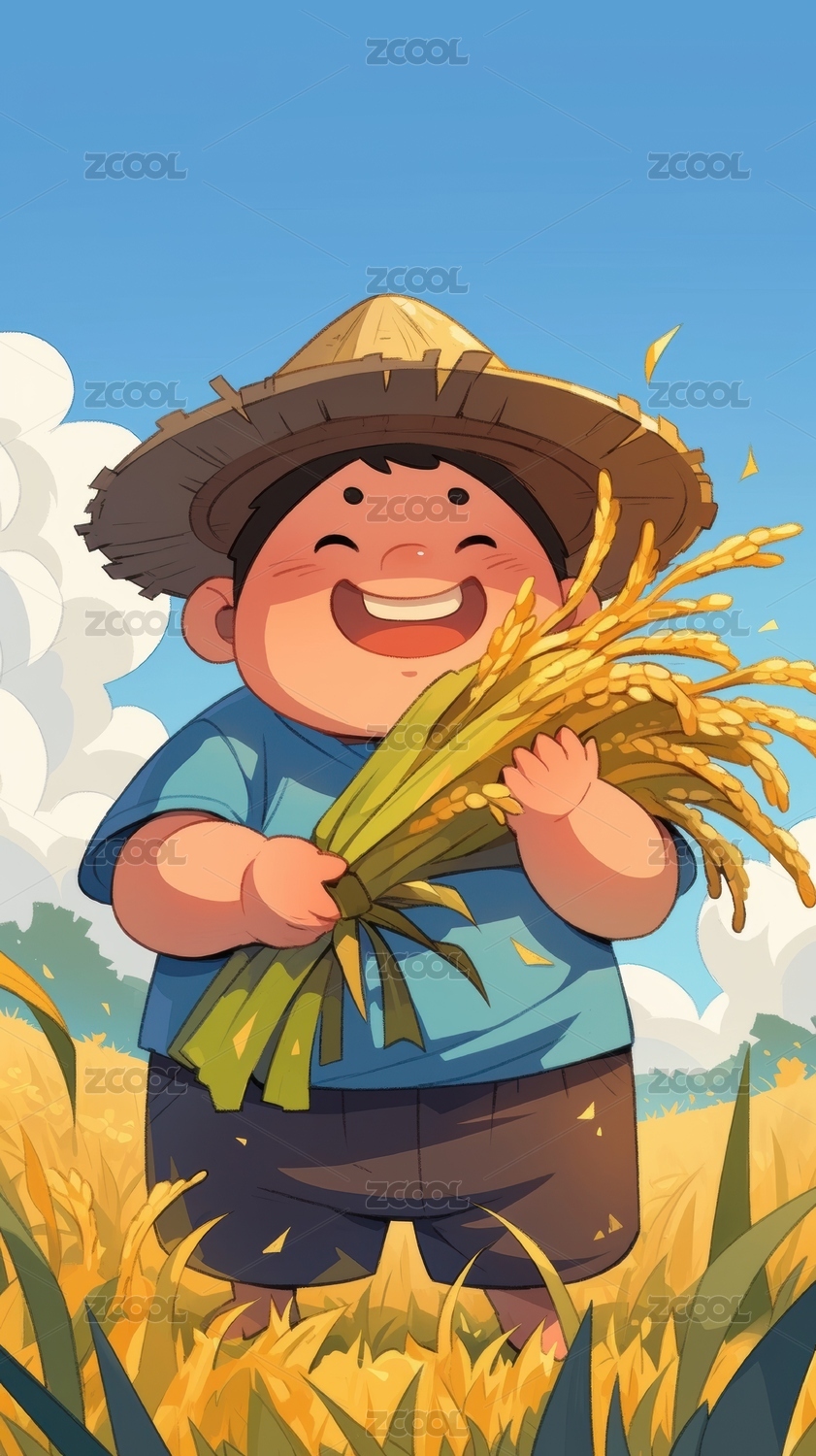 小男孩在田里抱着稻谷