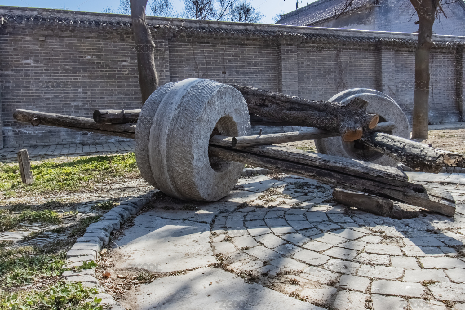 中国山东省临沂市沂蒙红色影视基地内沂蒙山村的石碾子