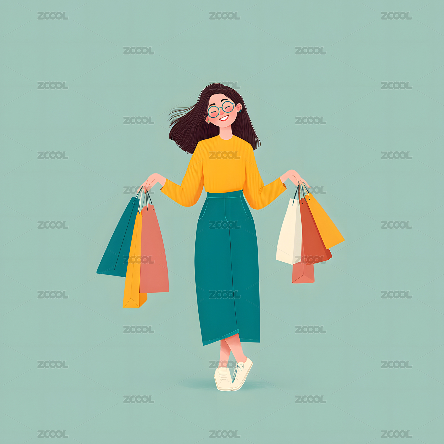 年轻时尚的女士手提购物袋网络购物折扣插画
