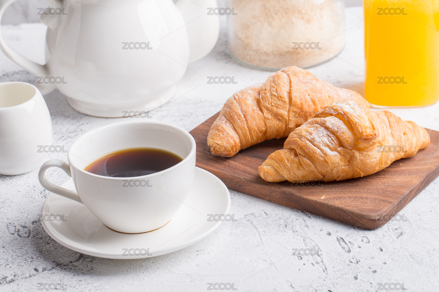 一桌有可颂面包橙汁咖啡的美味早餐
