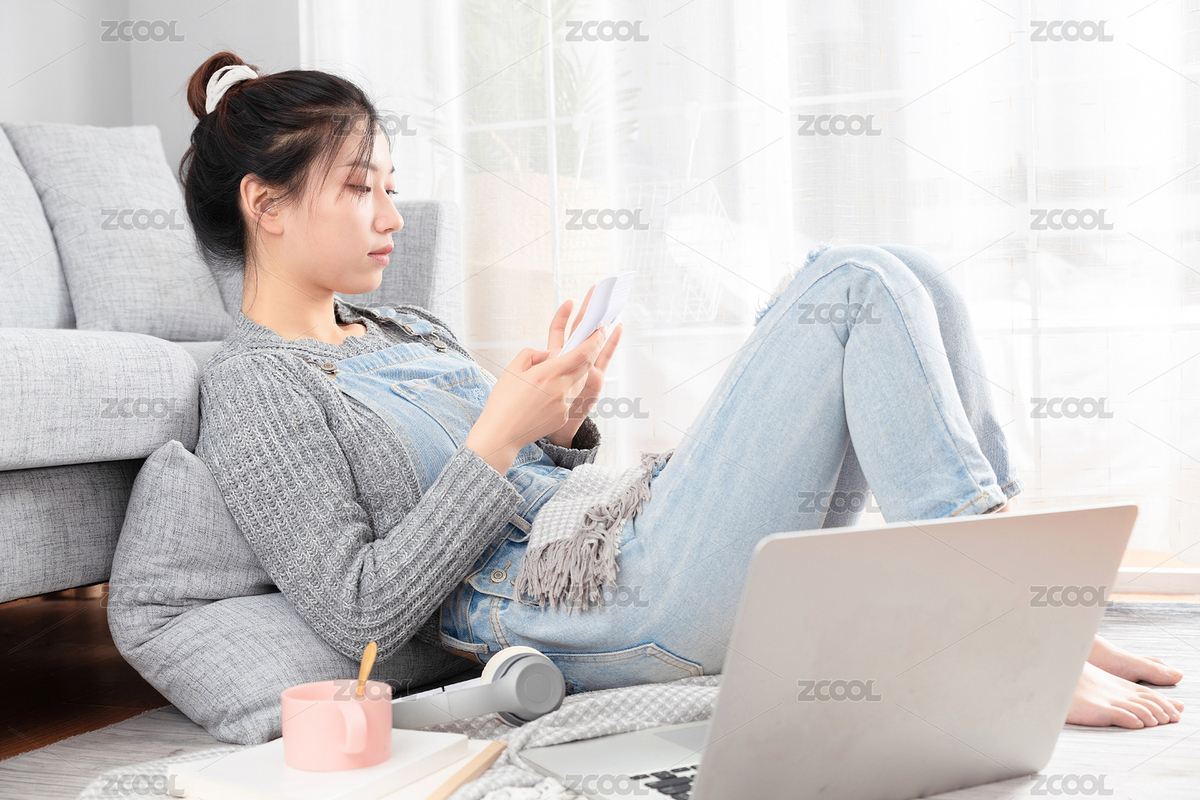 躺在沙发上使用电脑的亚洲女孩