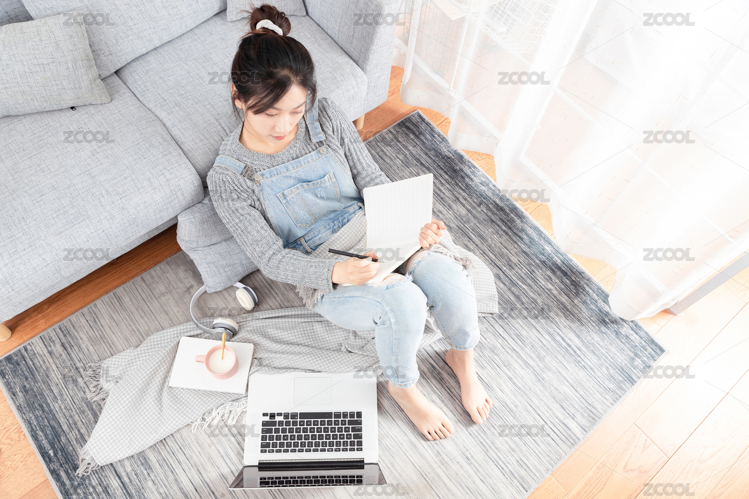 坐在沙发上边喝牛奶边看电脑的亚洲女孩