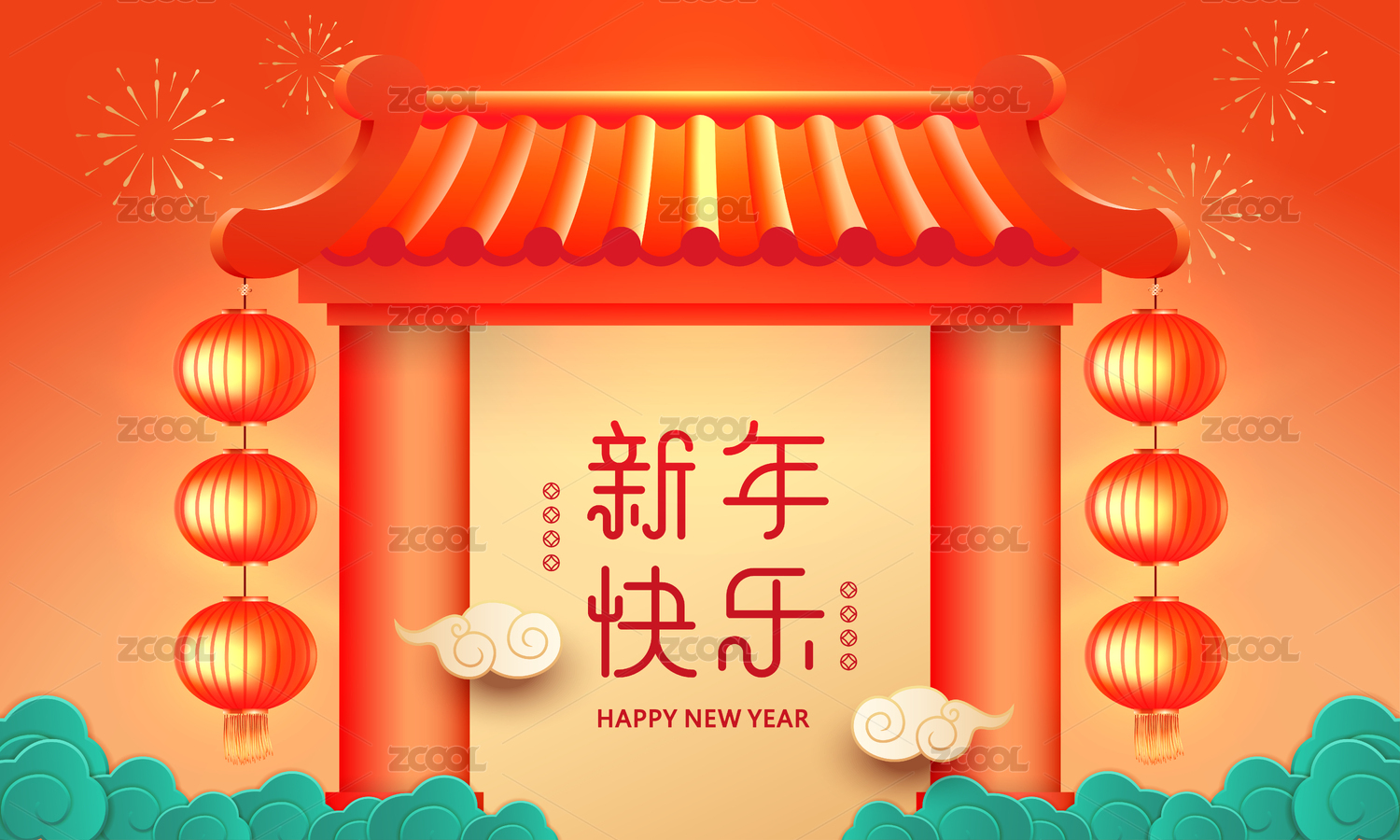 中国传统新年图形设计,悬挂的灯笼和祥云