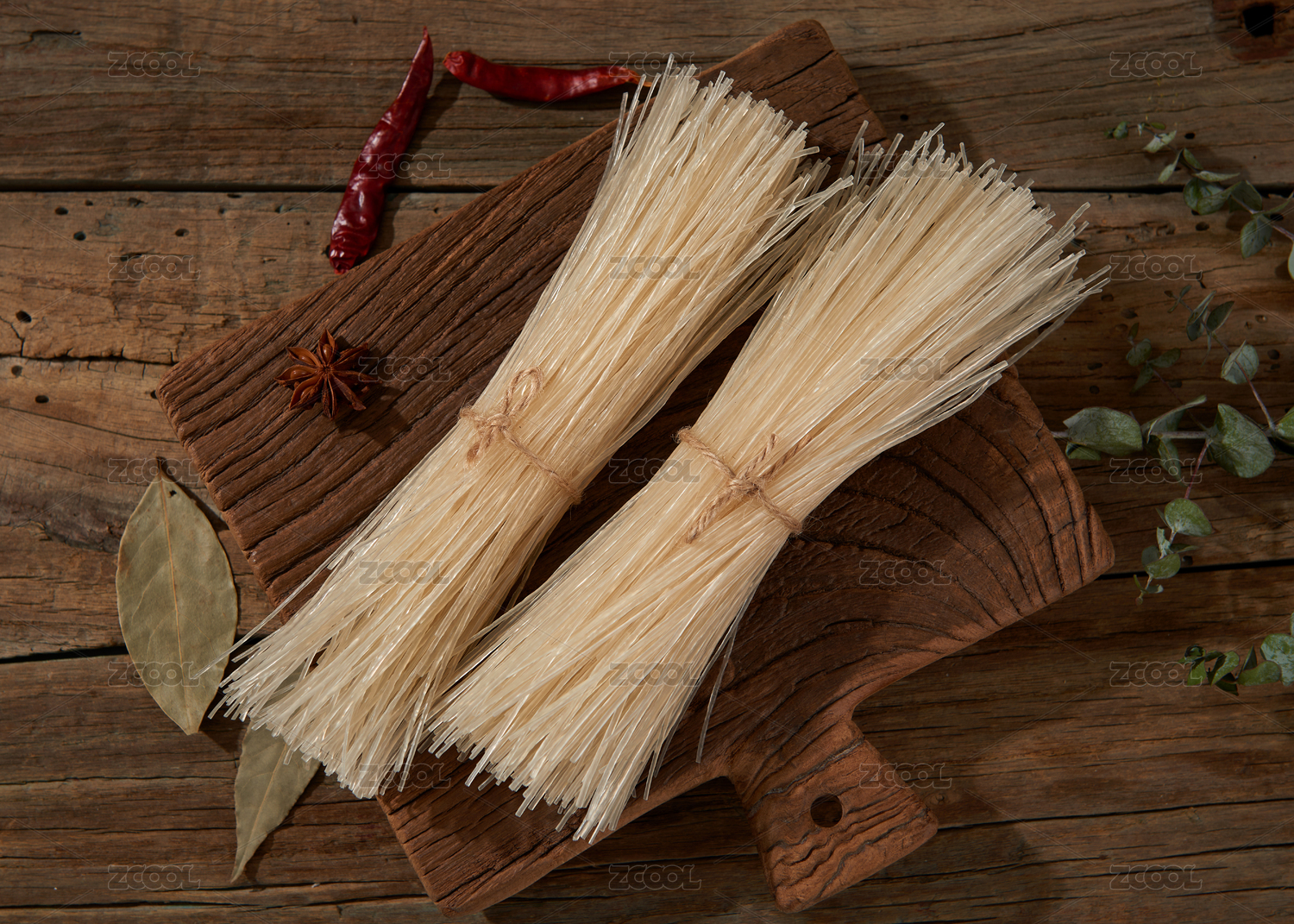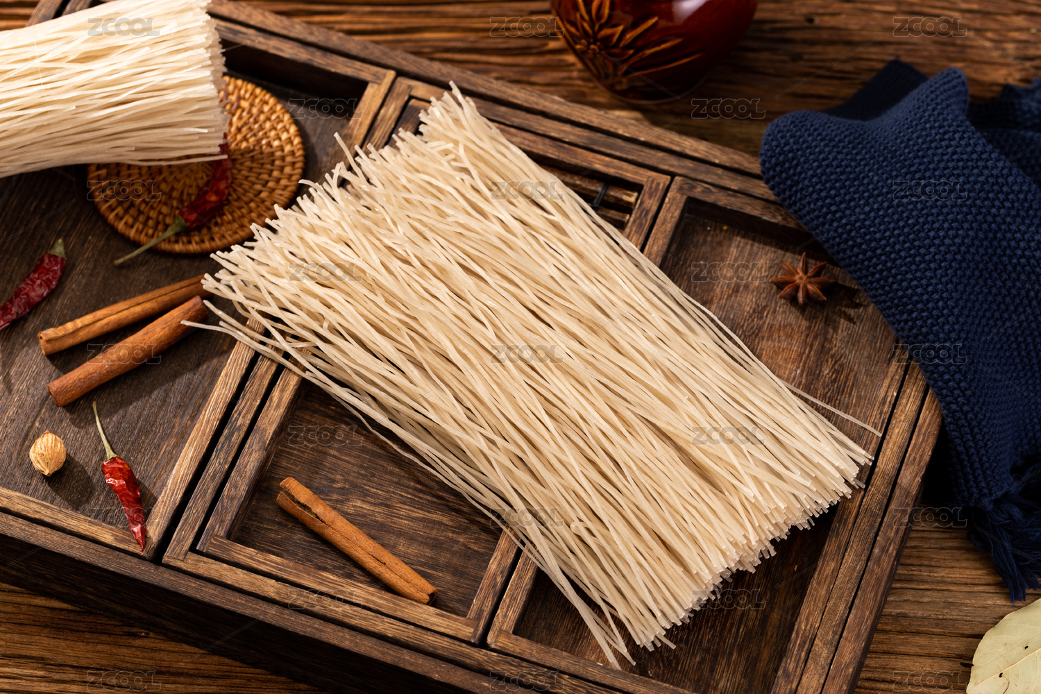 木纹背景上摆放的干米粉