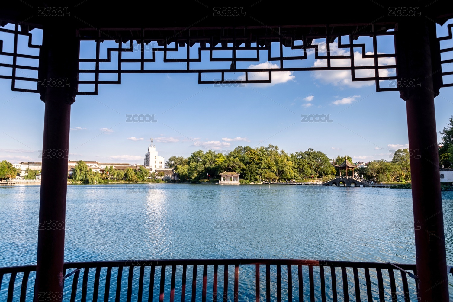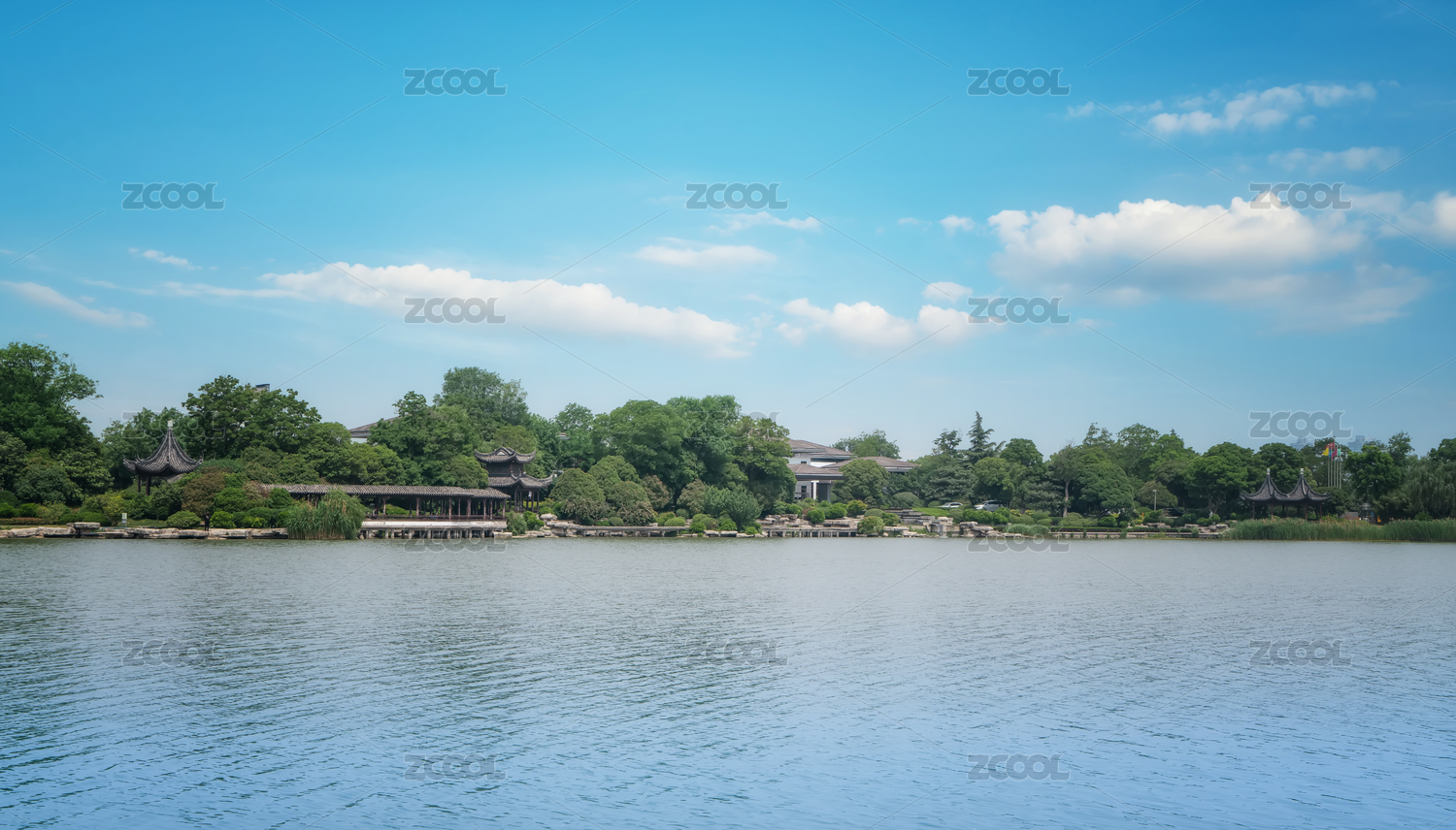 水乡,湖泊,古建筑,水景,公园,水面倒影,园林,树木,蓝天白云,户外