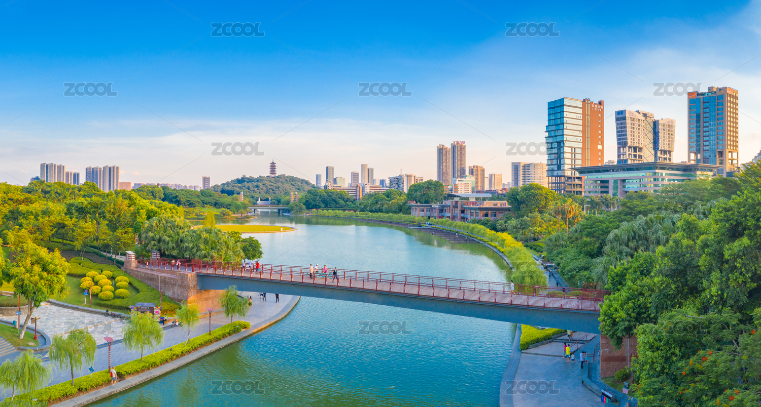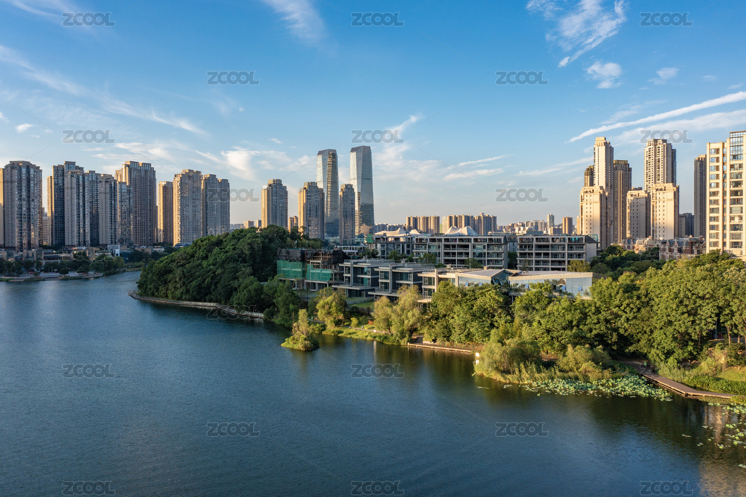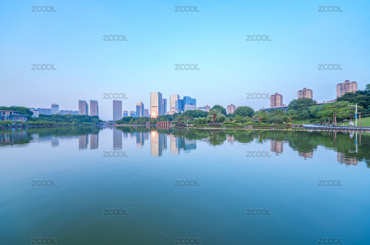 佛山千灯湖公园湖泊树林与城市高楼建筑