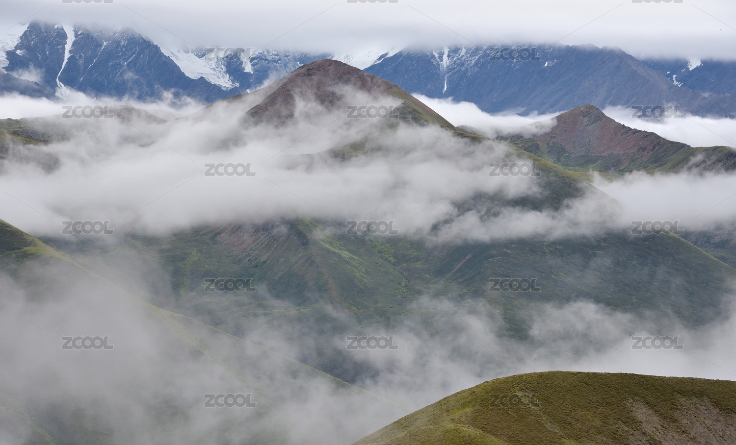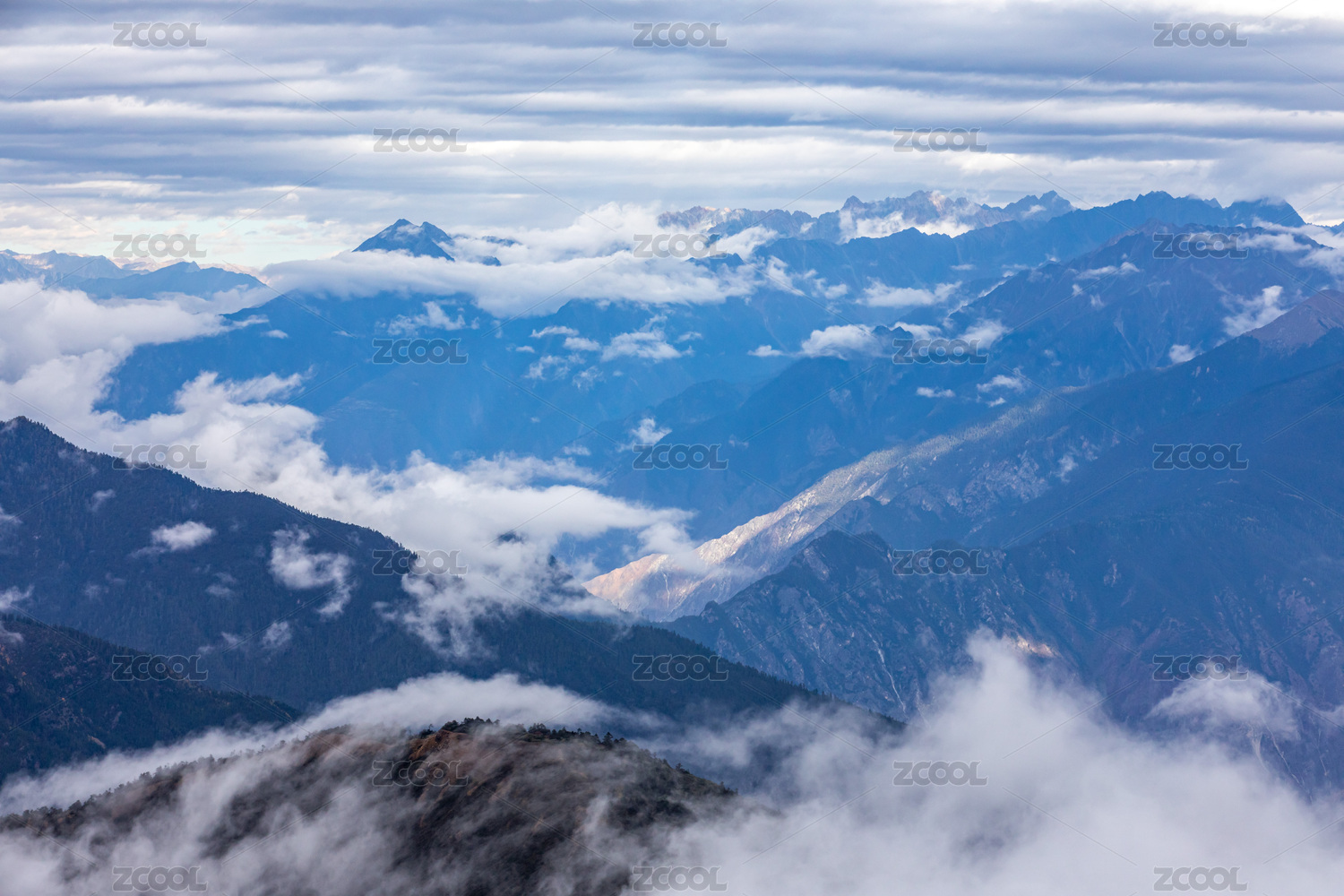 中国云层上的雪山和云层下的山谷